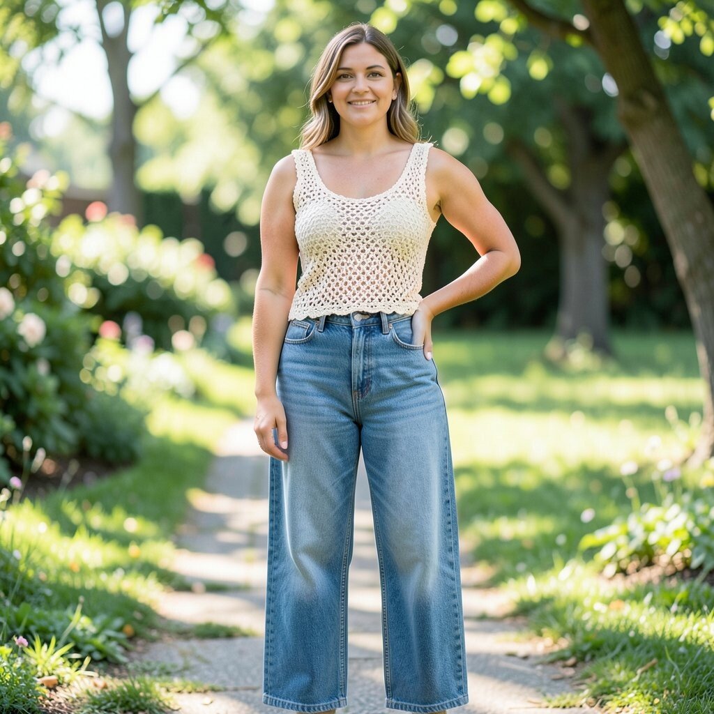 A crochet top with wide jeans brings a handmade summer feel that looks soft and stylish. The open texture of the top adds interest and helps the outfit breathe in warm weather.