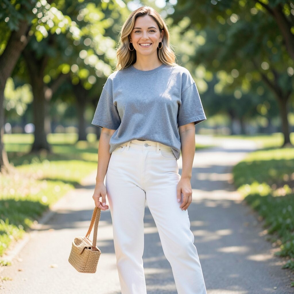 A relaxed tee with white jeans gives a bright, crisp outfit that feels fresh on hot days. The light denim color makes the whole look feel airy and clean.