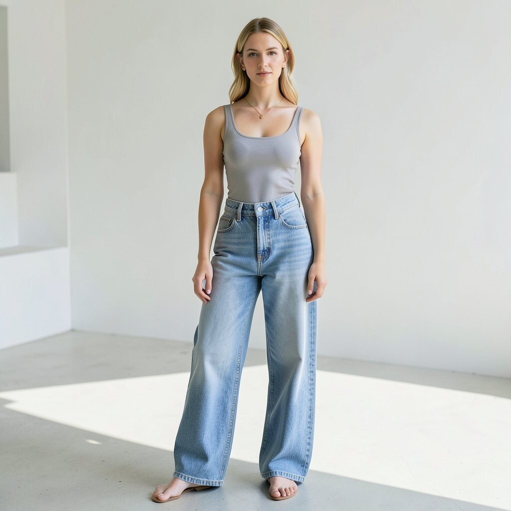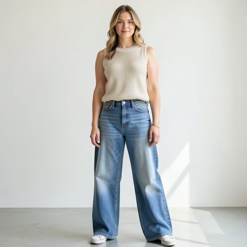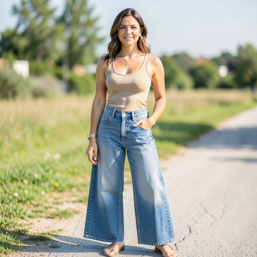 A sleeveless knit top and wide-leg jeans create a soft, stylish shape that feels easy in summer. The smooth top and flowing denim give a balanced look that feels put together.