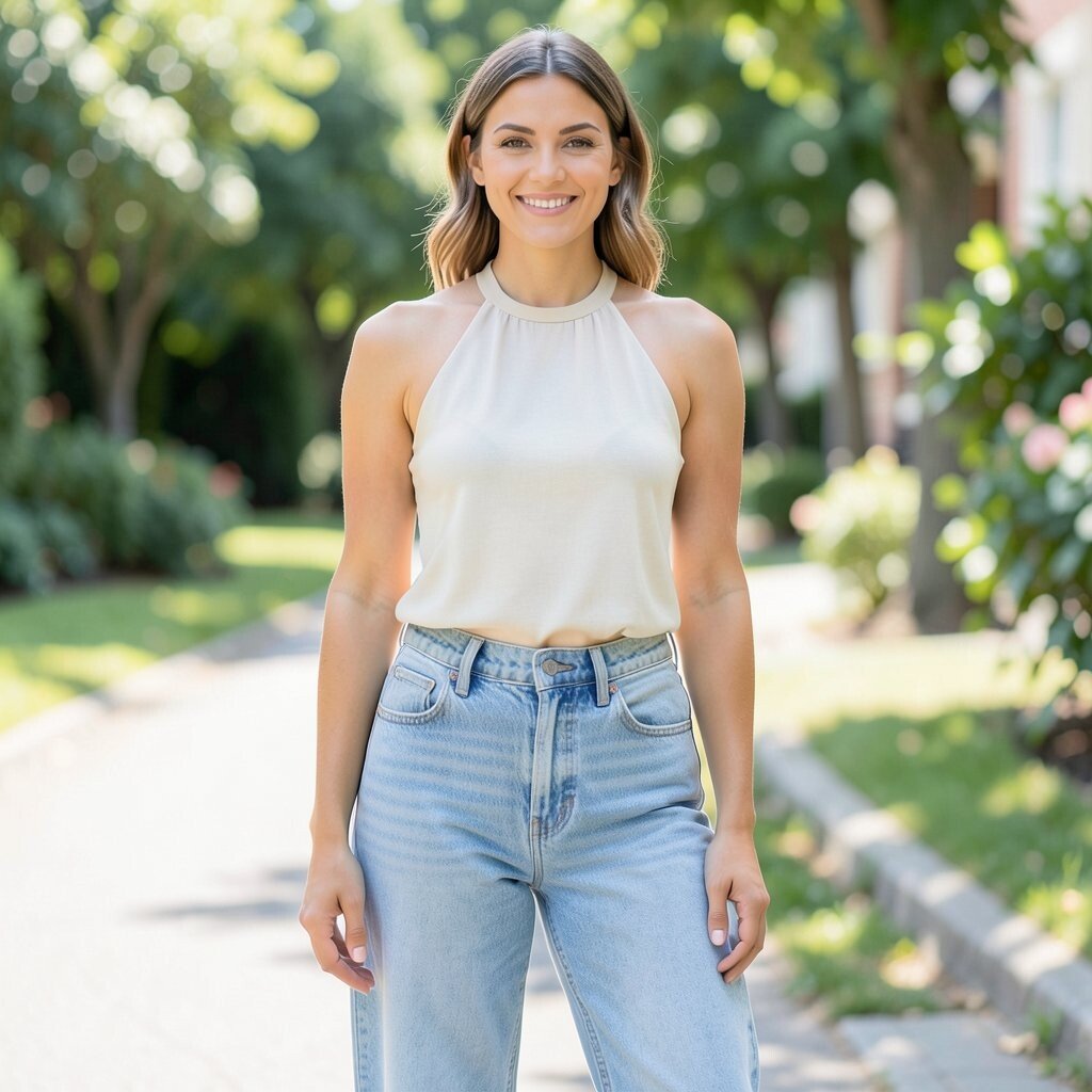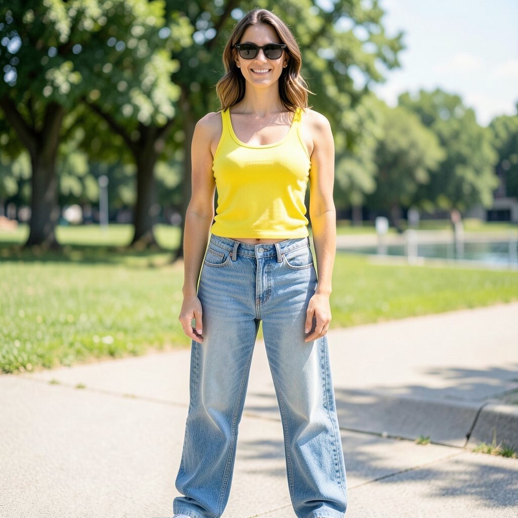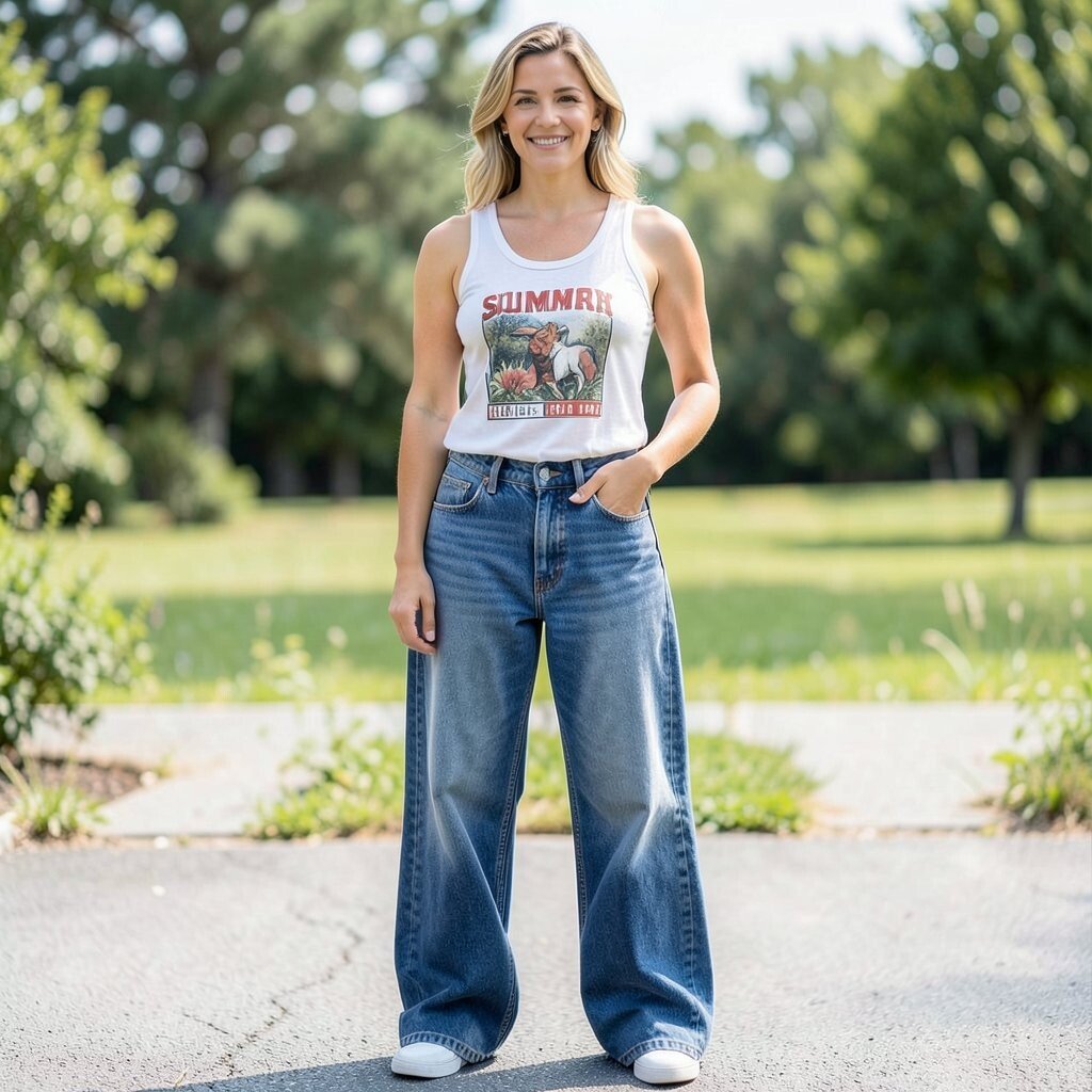 This pairing is great for hot weather because the tank is light and the jeans are loose enough to feel easy. Add white sneakers or flat slides and keep accessories simple.