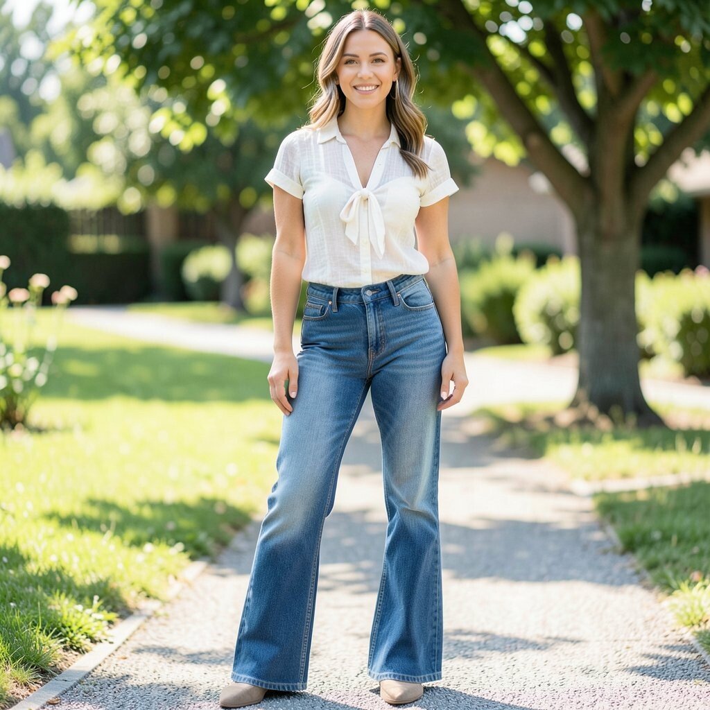 A tie-front top with flare jeans creates a fun shape that feels playful and flattering. The tied waist brings focus to the middle, while the flare leg adds movement.