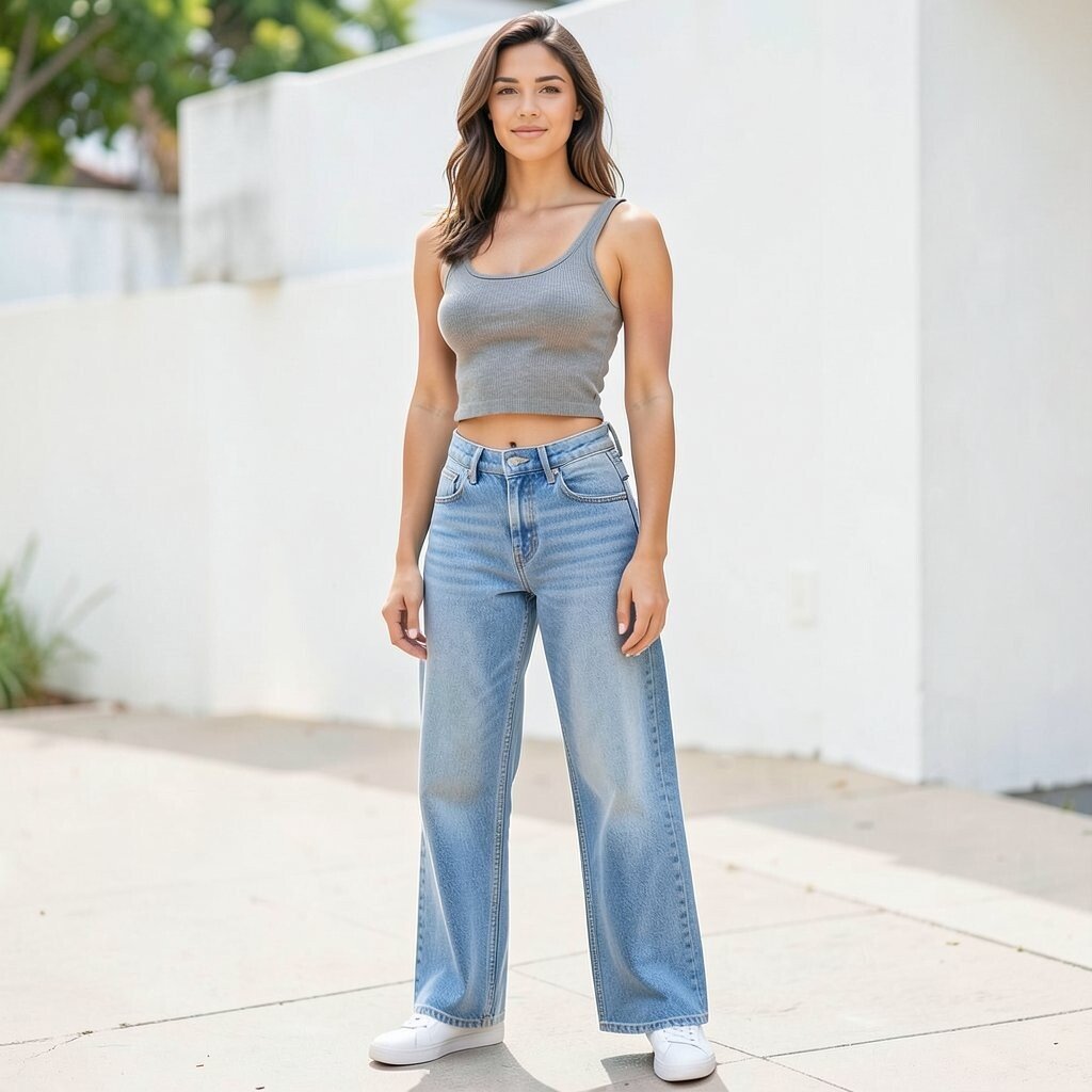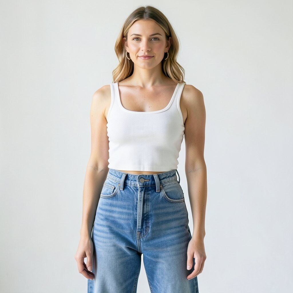 A cropped tank with straight-leg jeans gives a simple shape that feels modern and easy. The short top balances the longer denim line and keeps the outfit breezy.