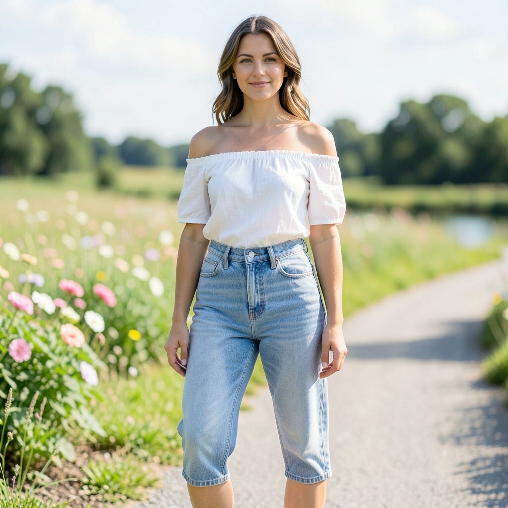 An off-shoulder top brings a flirty, breezy feel to cropped jeans. The neckline shows a little skin and makes the outfit feel light for warm afternoons.