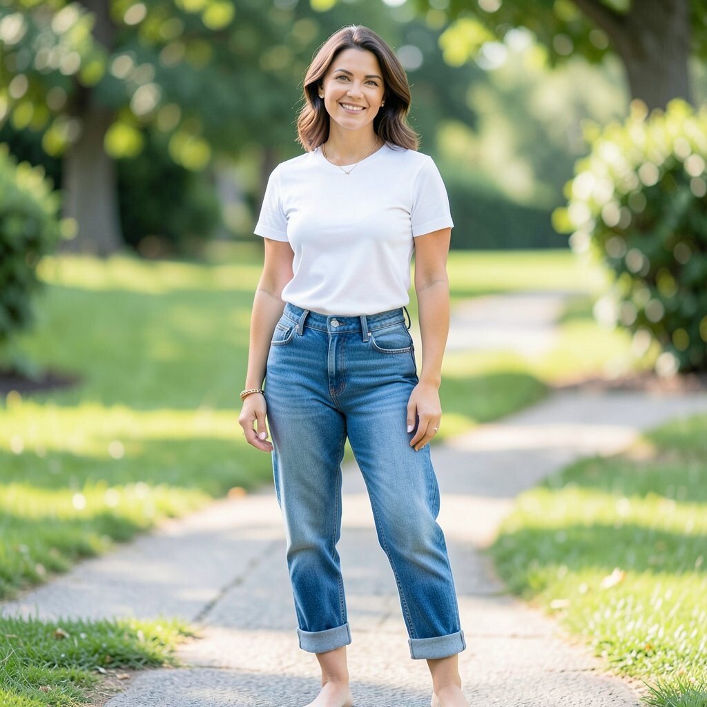 This look is comfortable for long days because the tee feels soft and the jeans do not drag. Slip-on sneakers, loafers, or sandals all work well with it.
