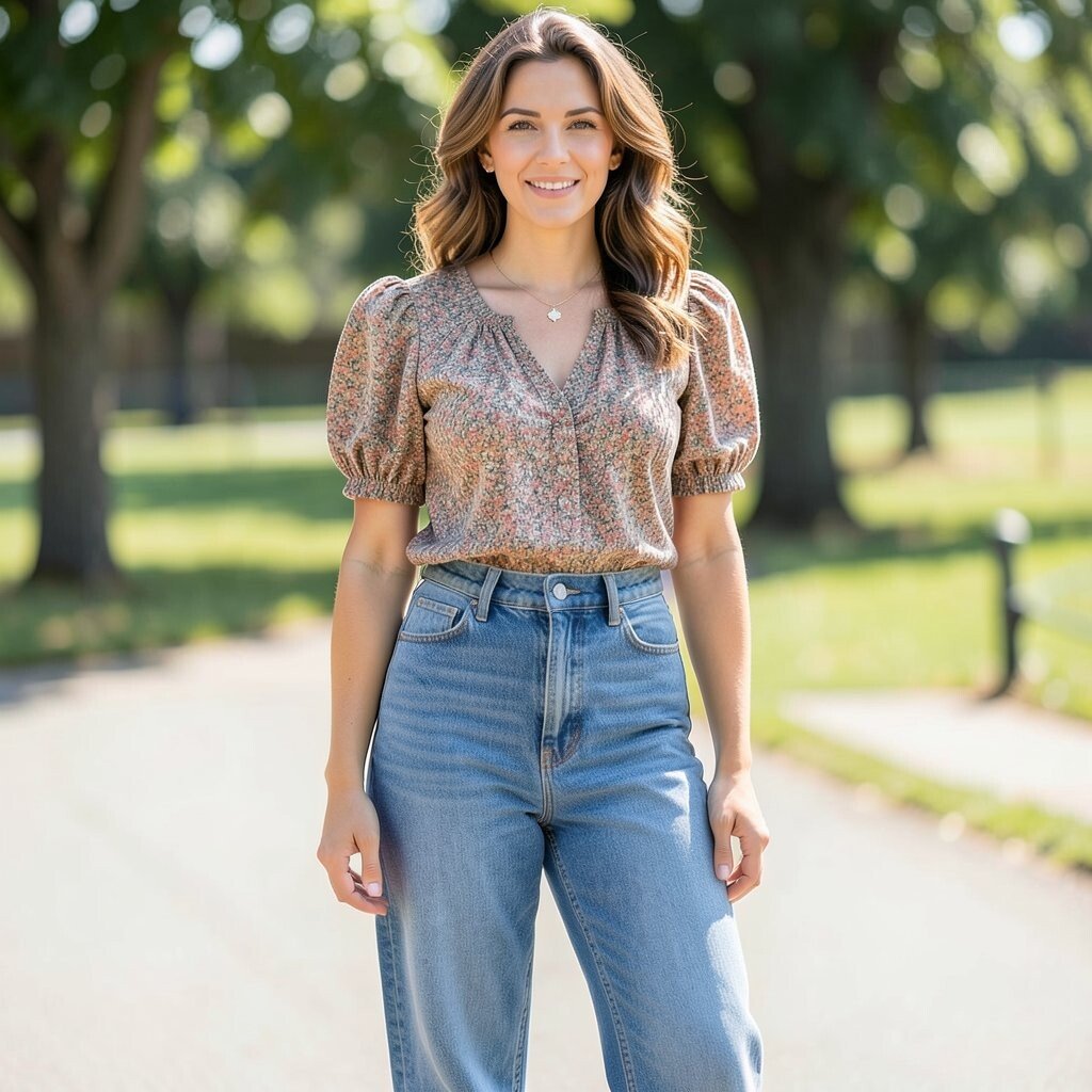A puff-sleeve blouse with straight jeans creates a pretty shape that feels soft and feminine. The sleeves add volume up top, while the jeans keep the look balanced.