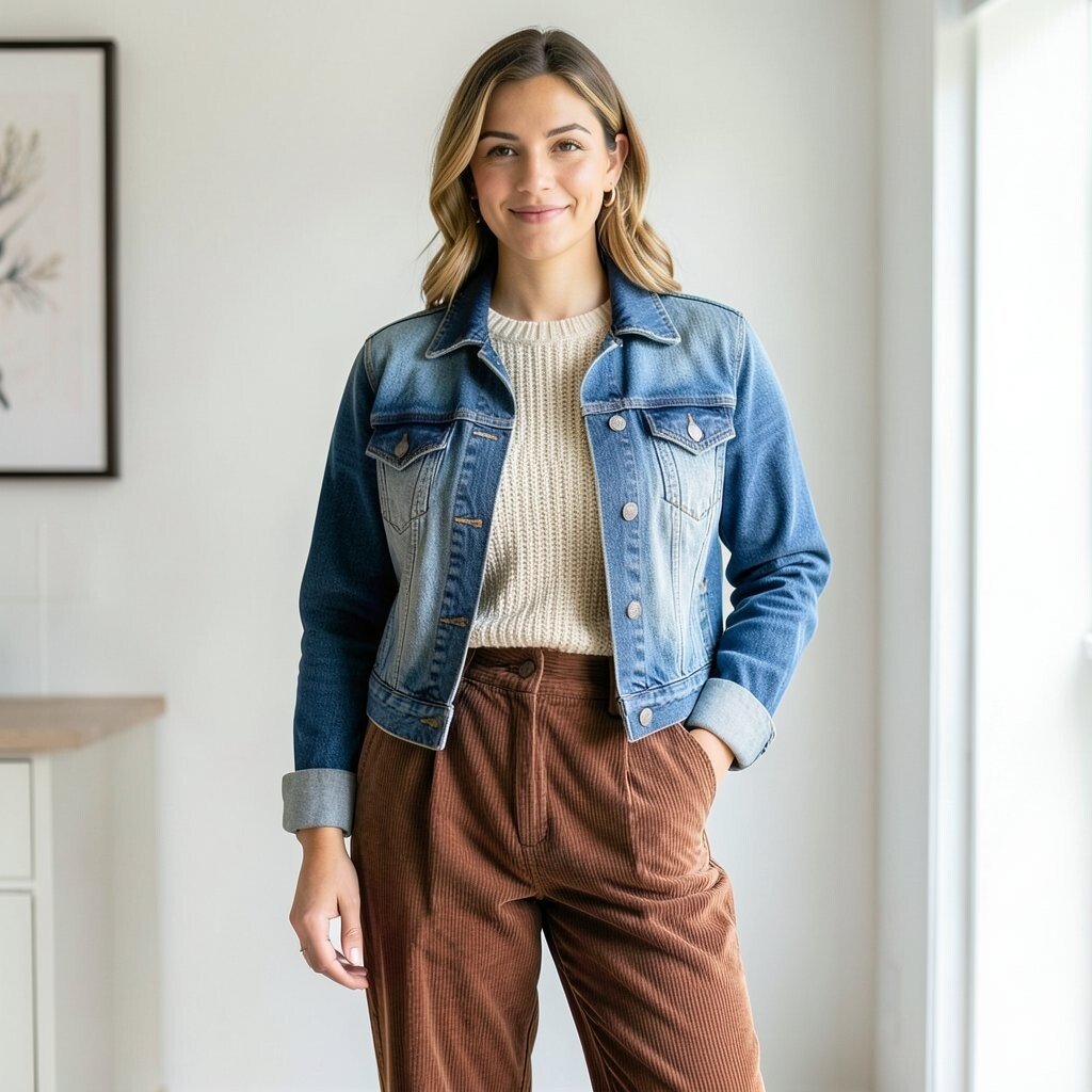 A knit top with corduroy pants and a jeans jacket brings in soft texture and warm color. The denim balances the cozy feel of the corduroy and keeps the outfit fresh.