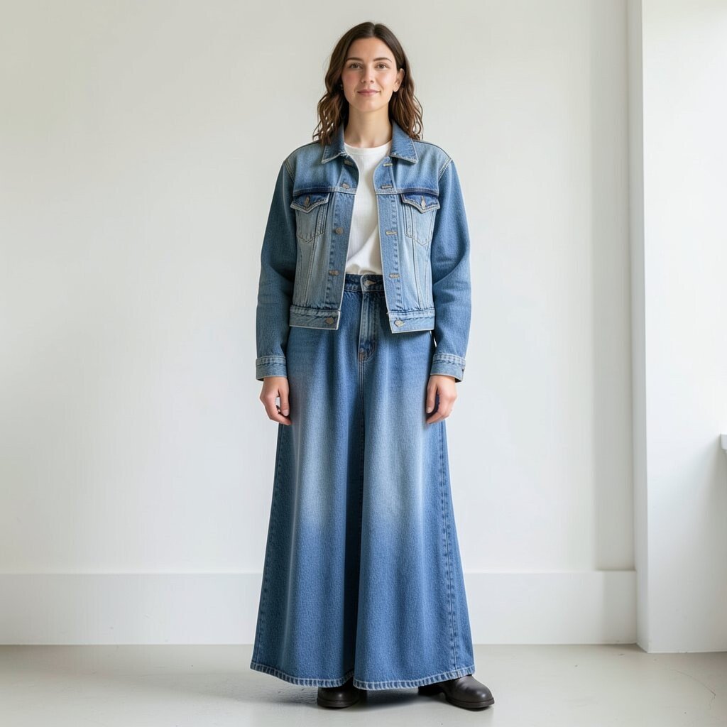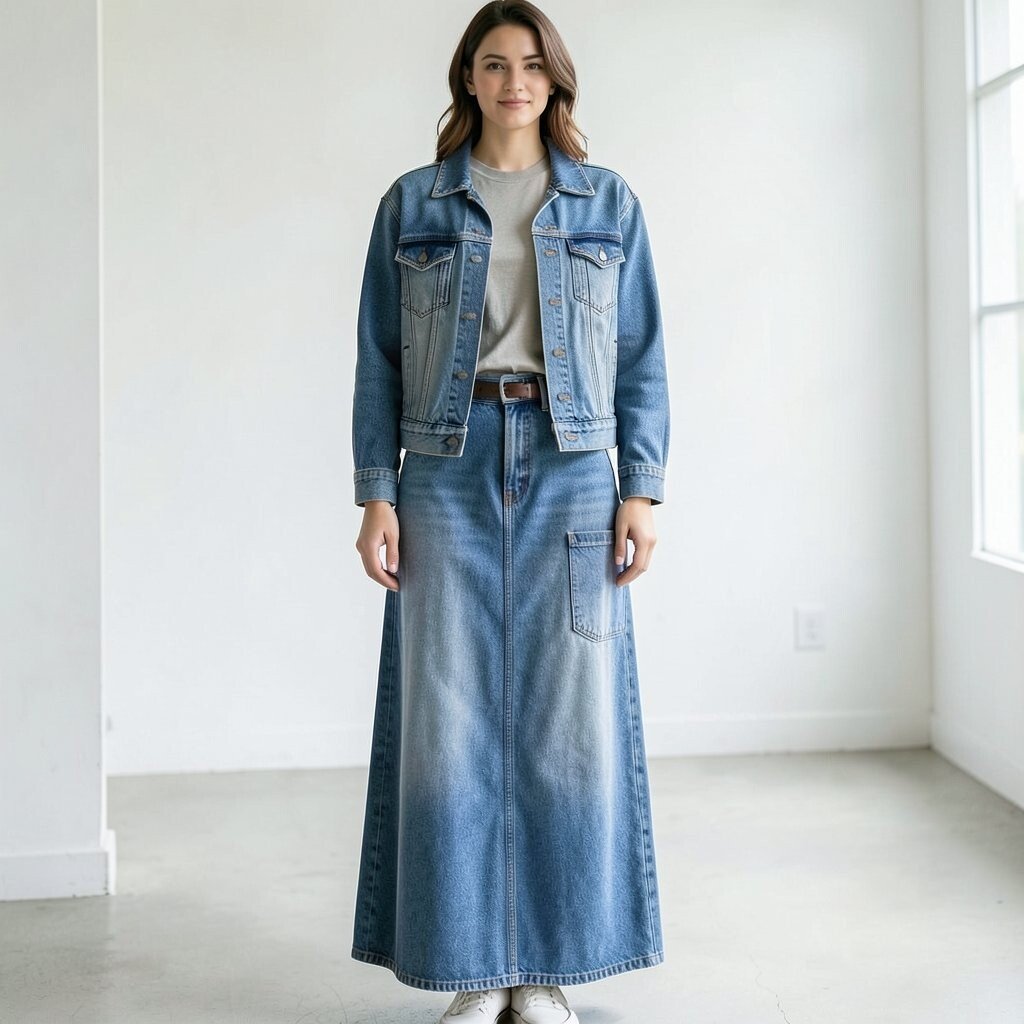 A long skirt with a pocket tee and jeans jacket creates a relaxed, artsy look. The denim adds structure while the skirt keeps the outfit soft and flowing.