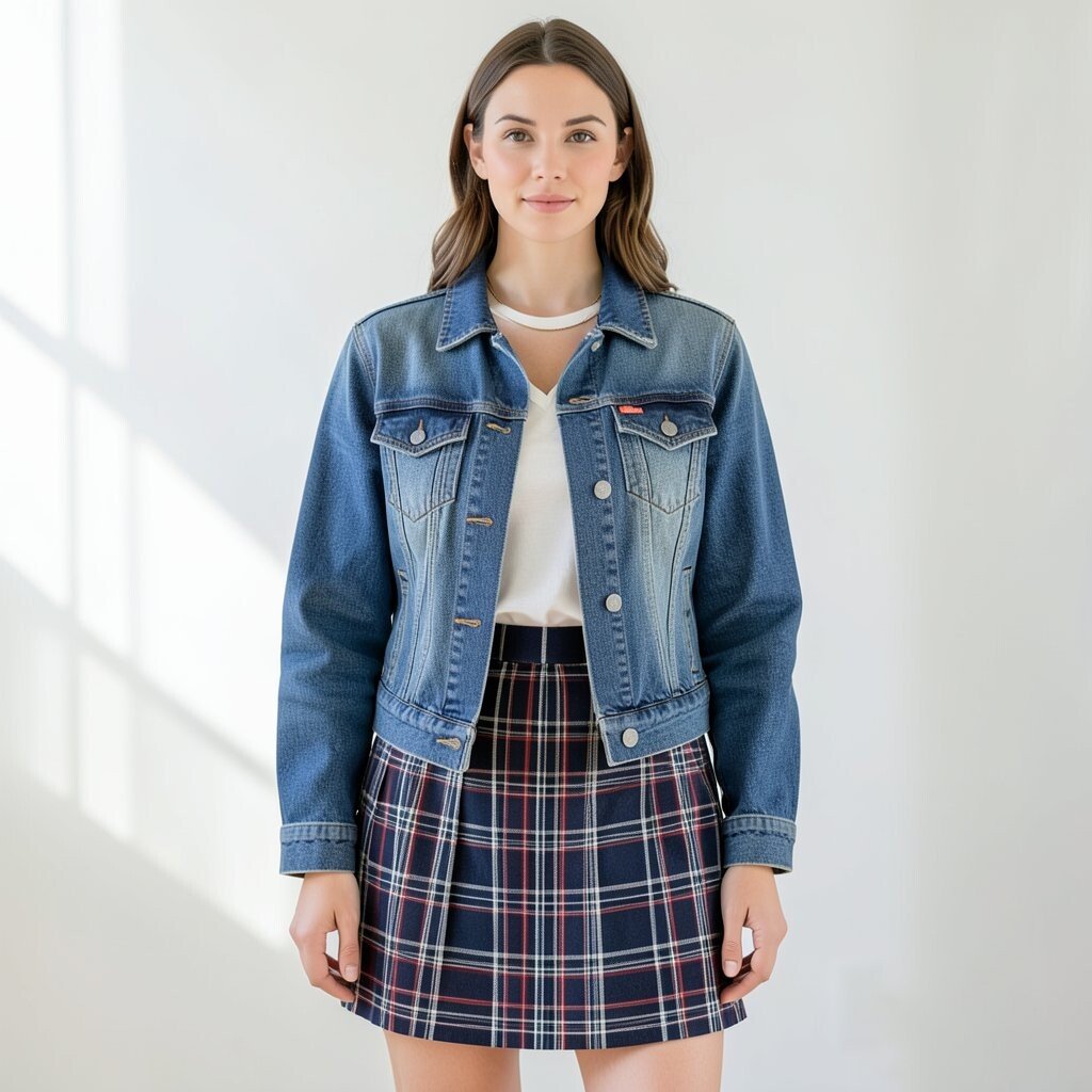 A plaid skirt with a cropped jeans jacket gives a school-day look with a playful edge. The short jacket helps show the waist and keeps the outfit from feeling heavy.