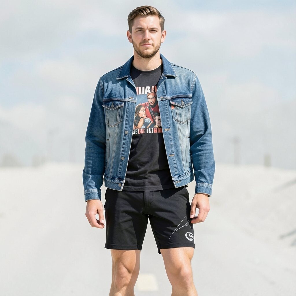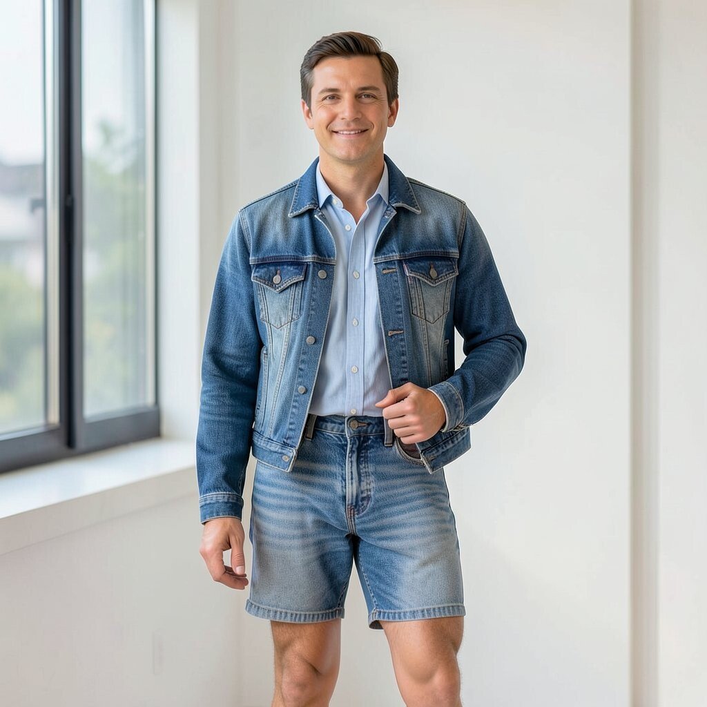A button-up shirt with denim shorts and a jeans jacket feels crisp and casual at the same time. The jacket gives the outfit a relaxed finish and keeps it from looking too neat.