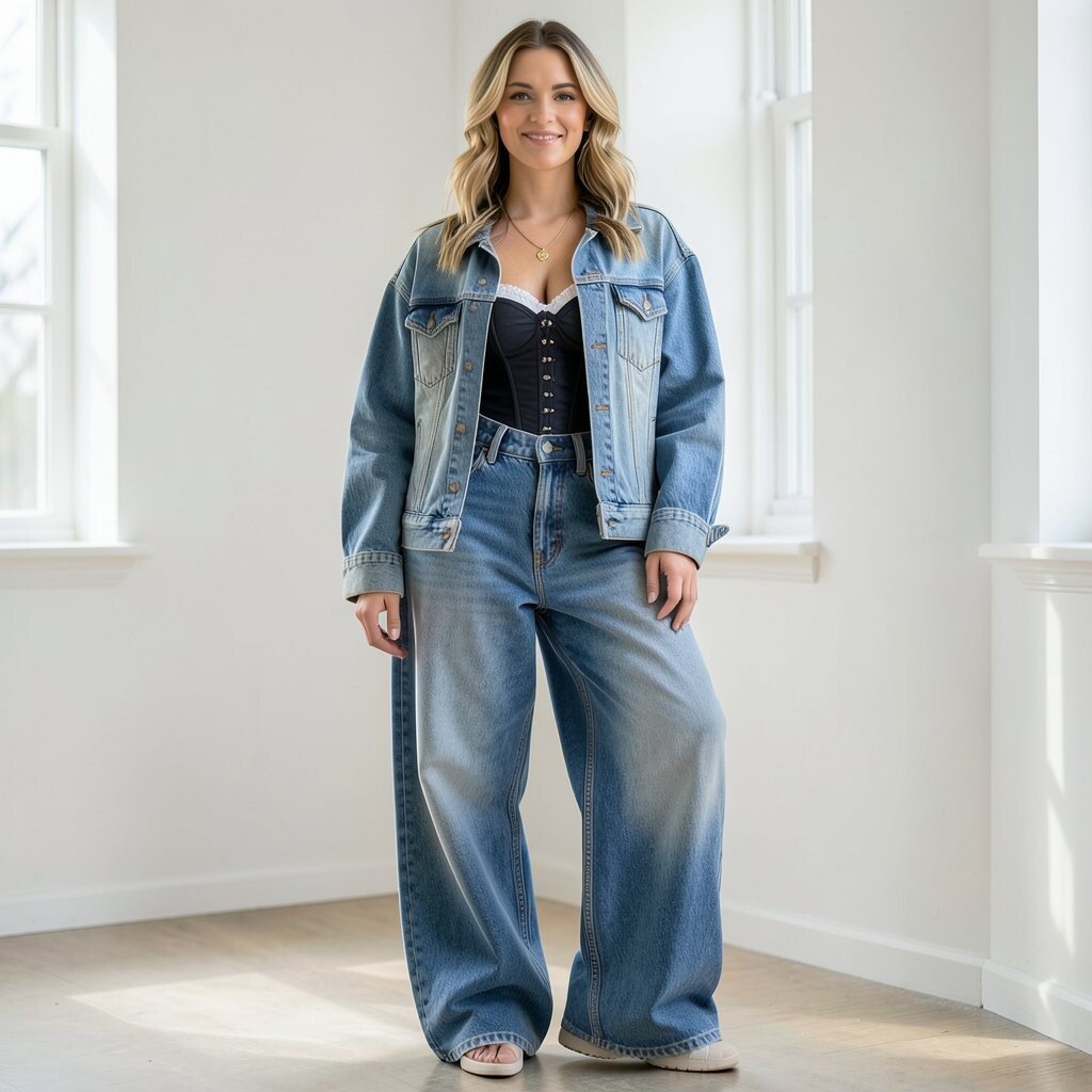 A corset top under a jeans jacket with baggy jeans gives a strong mix of fitted and loose shapes. The denim softens the look and makes it feel more casual.