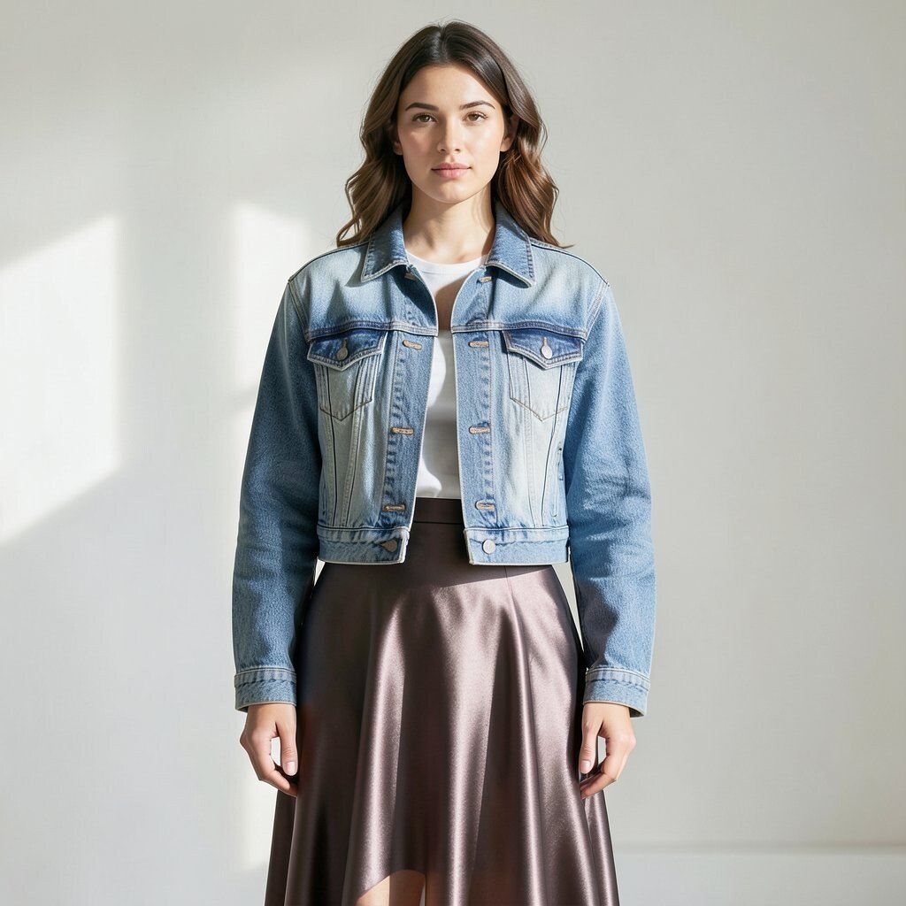A satin skirt with a boxy jeans jacket mixes soft shine and sturdy denim in a cool way. The contrast makes the outfit look thoughtful without feeling fussy.