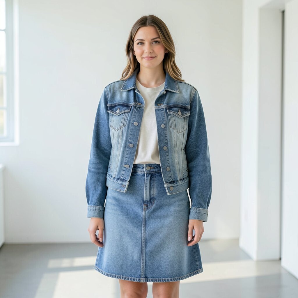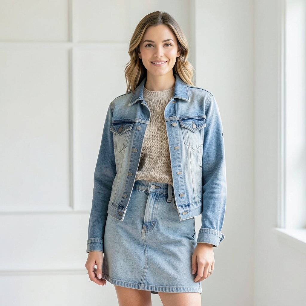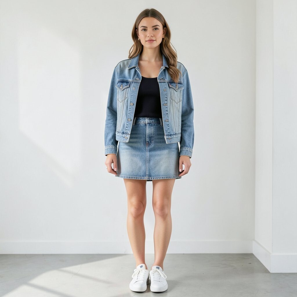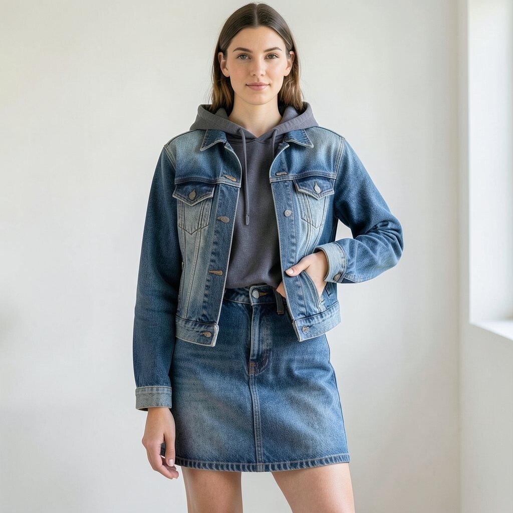 A denim skirt with a matching jeans jacket gives a classic denim-on-denim look. When the washes are close, the outfit feels bold and very nineties.