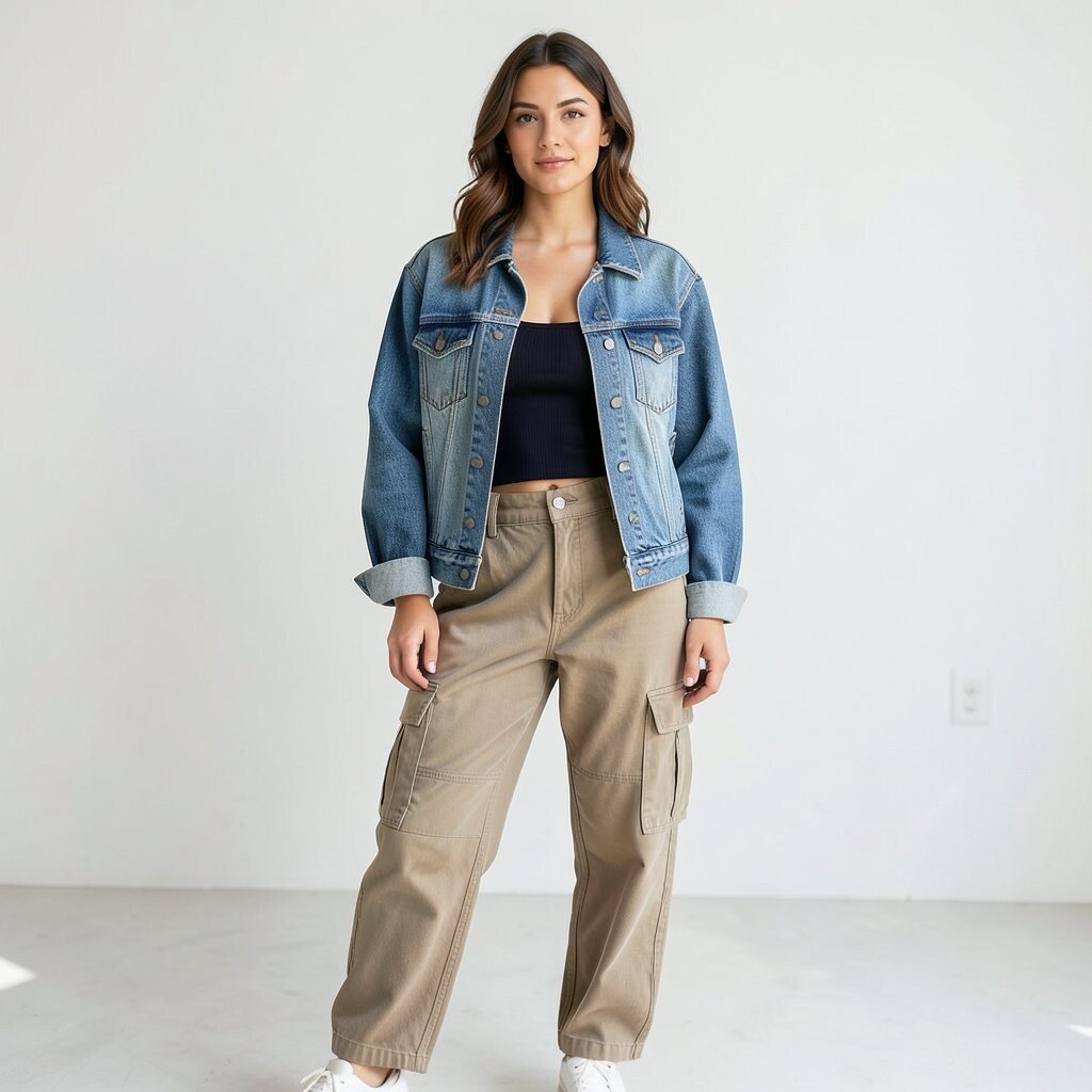 Earthy cargo colors like olive or tan keep the look easy to style. You can also add a tiny bag or a chain necklace for a little shine. Since cargo pants come in many price ranges, this outfit can fit almost any budget.