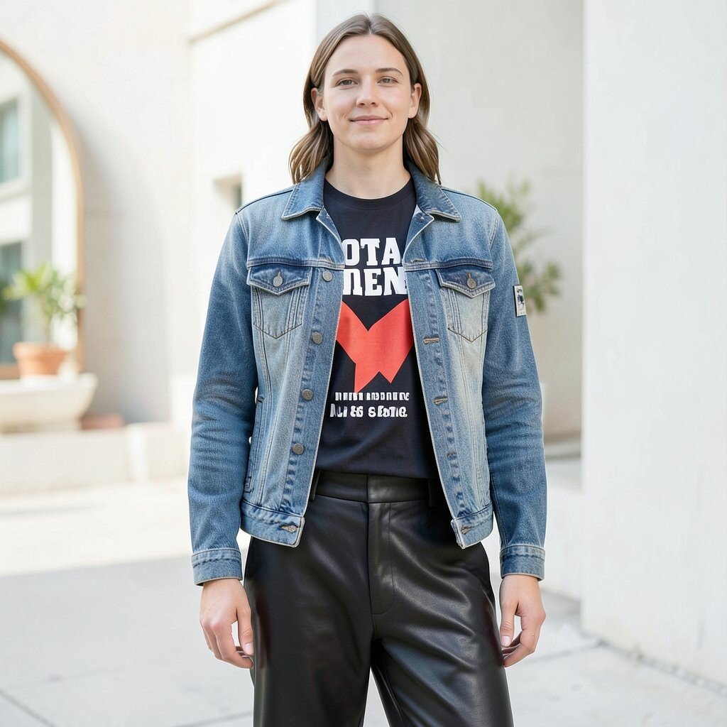 A band tee with a jeans jacket and leather pants gives a strong, cool look. The denim softens the shine of the leather and makes the outfit feel more wearable.