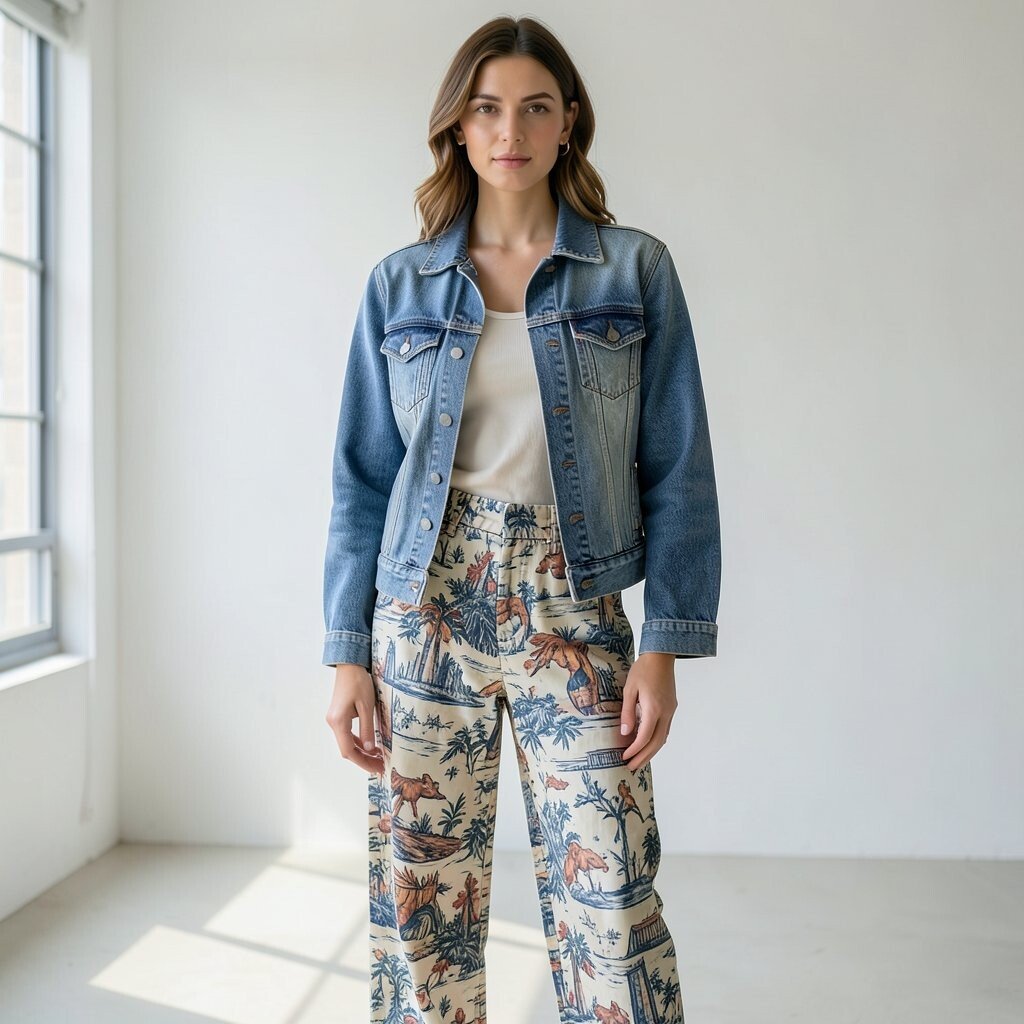 Printed pants with a simple tank and jeans jacket make a bold but easy outfit. The jacket helps calm the print so the look feels balanced.