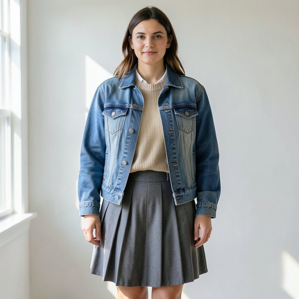 This mix is nice for days when you want something cute but not too dressy. Tights and loafers can make it feel preppy, while boots give it a stronger look. If you like color, pick a skirt with red, green, or blue lines that match the jacket wash.