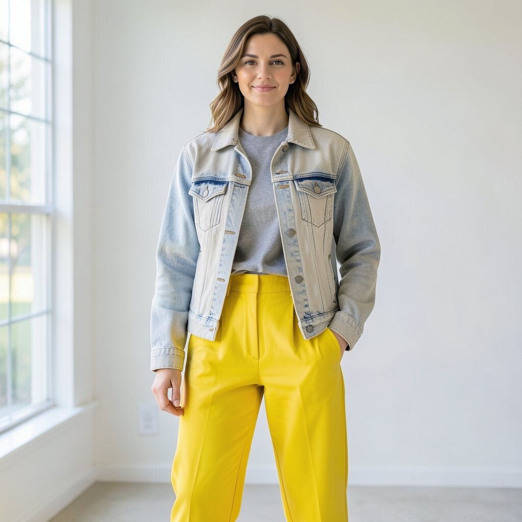 Bright pants with a neutral jeans jacket create a cheerful outfit that stands out fast. The denim tones down the color and keeps the whole look easy to wear.
