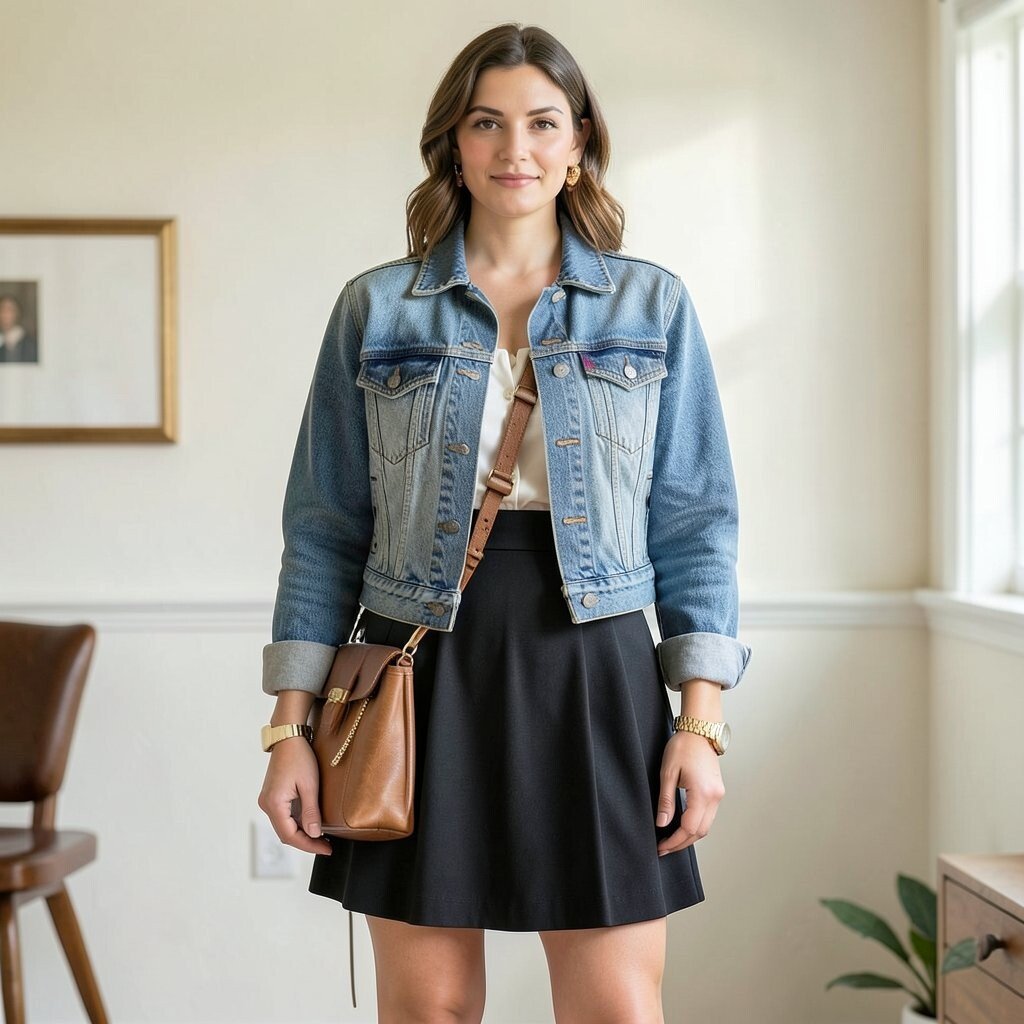 This outfit is easy to wear for brunch, shopping, or a weekend walk. A cropped jacket works well with a fuller skirt, while a longer jacket can balance a short dress. Sandals, flats, or low boots can all fit the look.