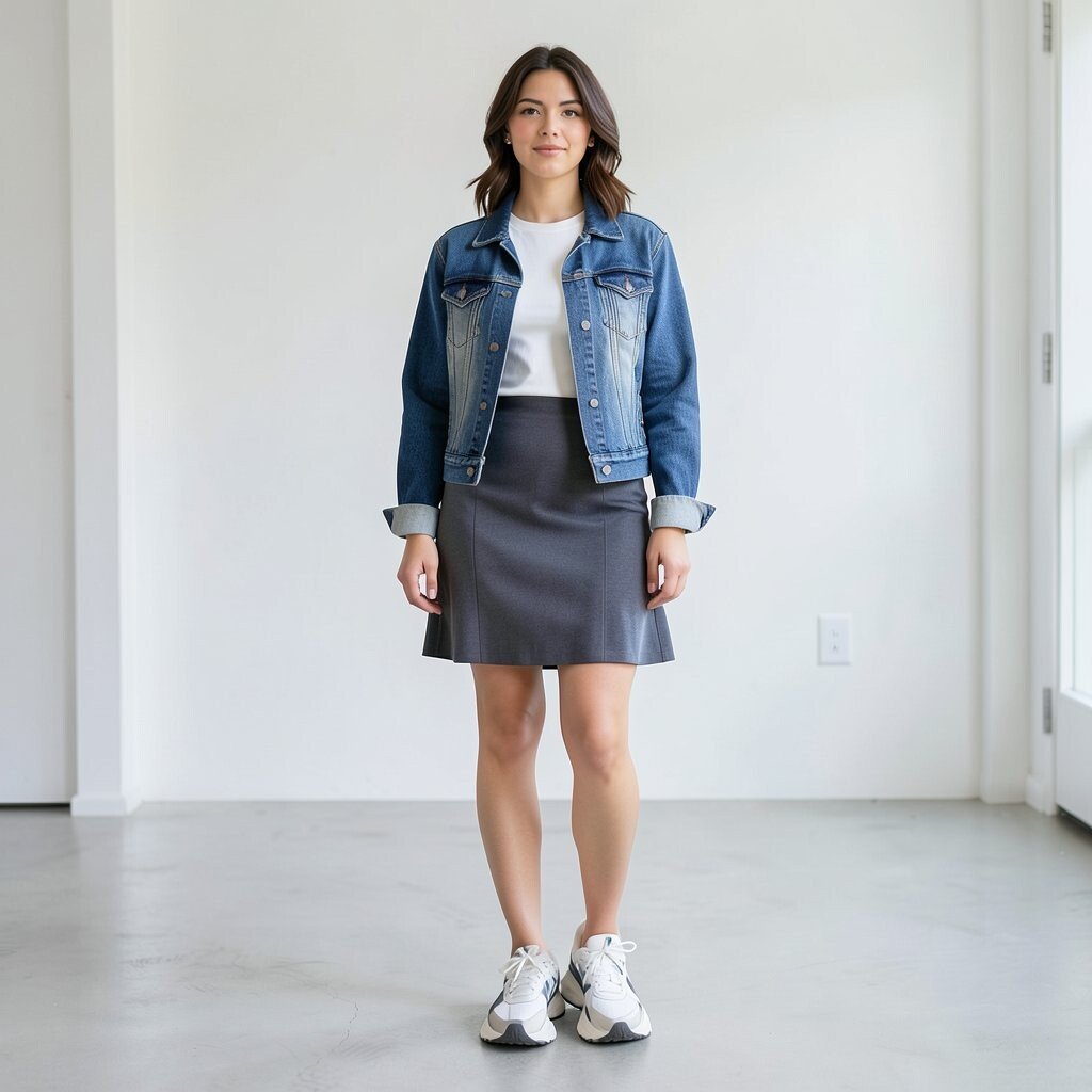 You can personalize the look with a bright top, a belt, or fun earrings. A thrifted skirt and jacket can make the outfit feel more unique and keep the cost low. If you want a softer look, choose a lighter wash and simple white shoes.