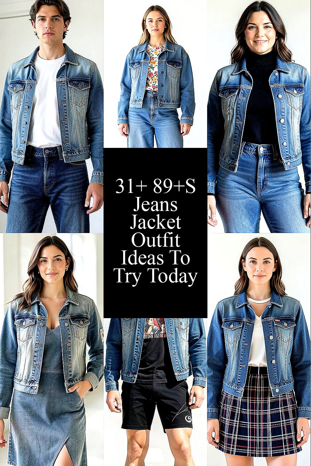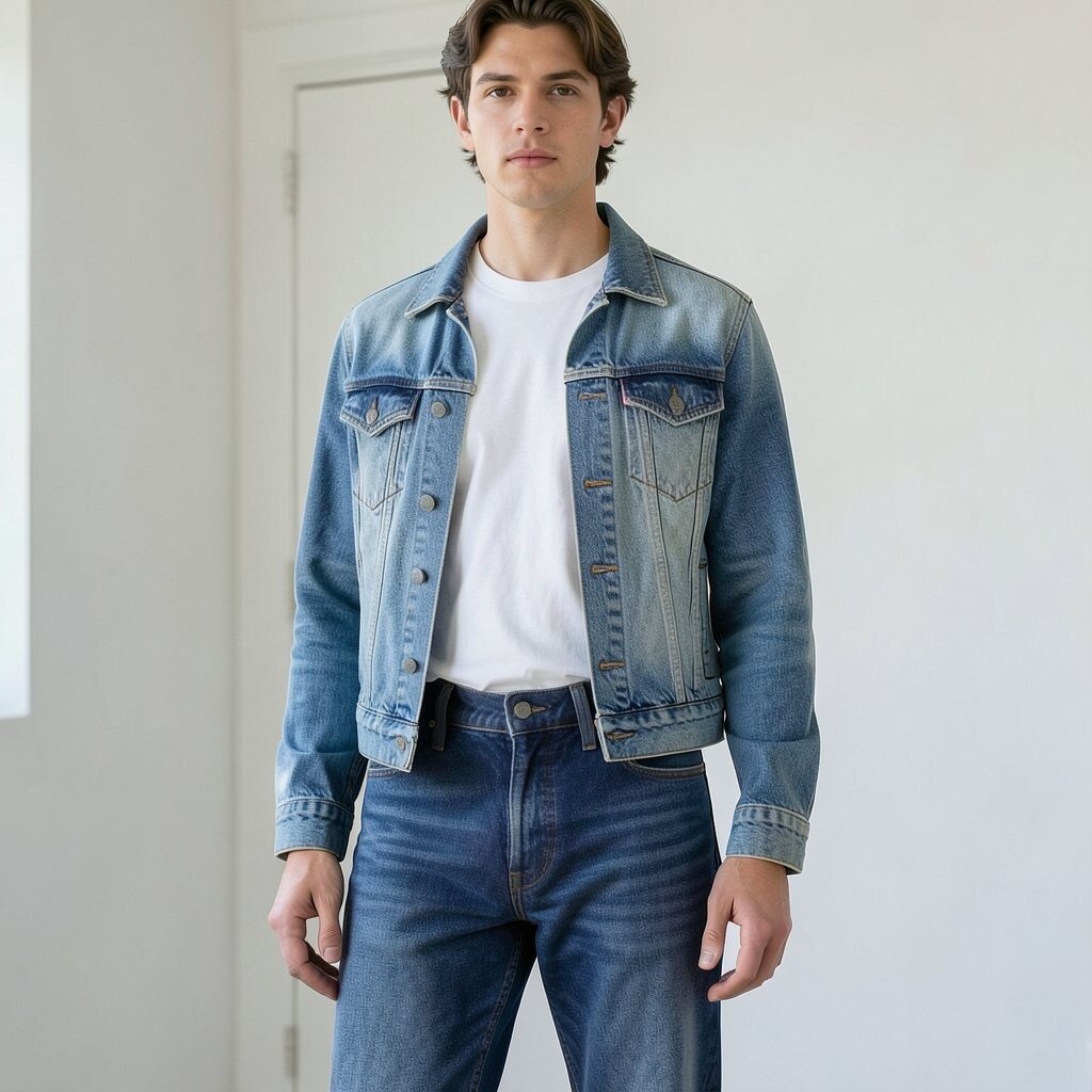 A light blue jeans jacket over a plain white tee gives a clean, timeless look. Straight jeans keep the shape simple and make the outfit feel easy to wear.