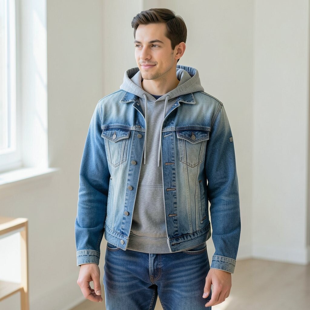 Wearing a hoodie under a jeans jacket brings back a classic street look from the nineties. The layers add warmth and make the outfit feel casual and easy.