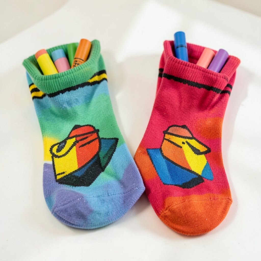 Crayon-themed socks are cheerful and easy to wear, with bright stripes or little crayon prints. They bring art-room style into everyday outfits.
