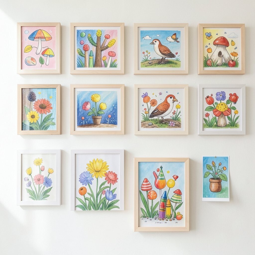 Crayon wall art prints bring a colorful look to a bedroom or playroom. They often feature rainbow lines, cute characters, or happy art messages.