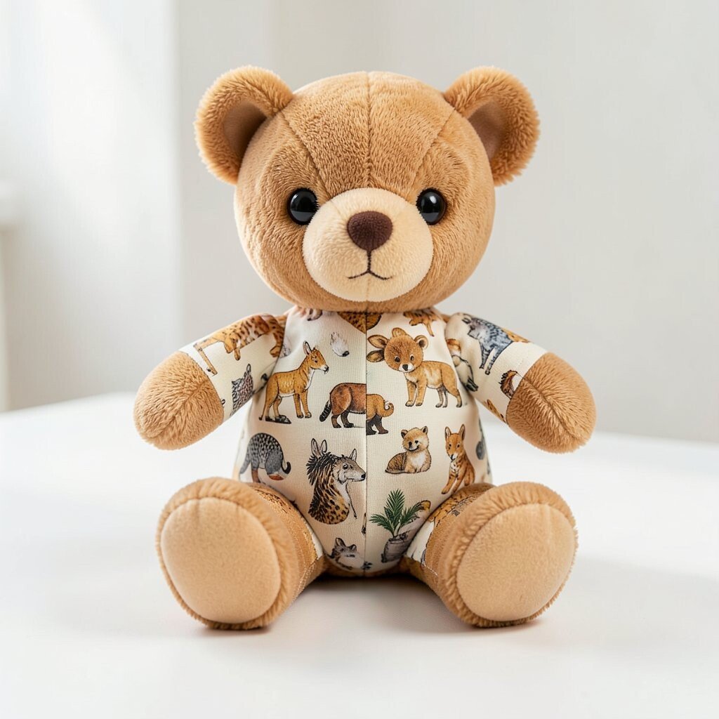 A teddy bear with animal print mixes a classic shape with a bold fabric pattern. Leopard spots, zebra stripes, or giraffe marks can give the bear a fresh and trendy look.