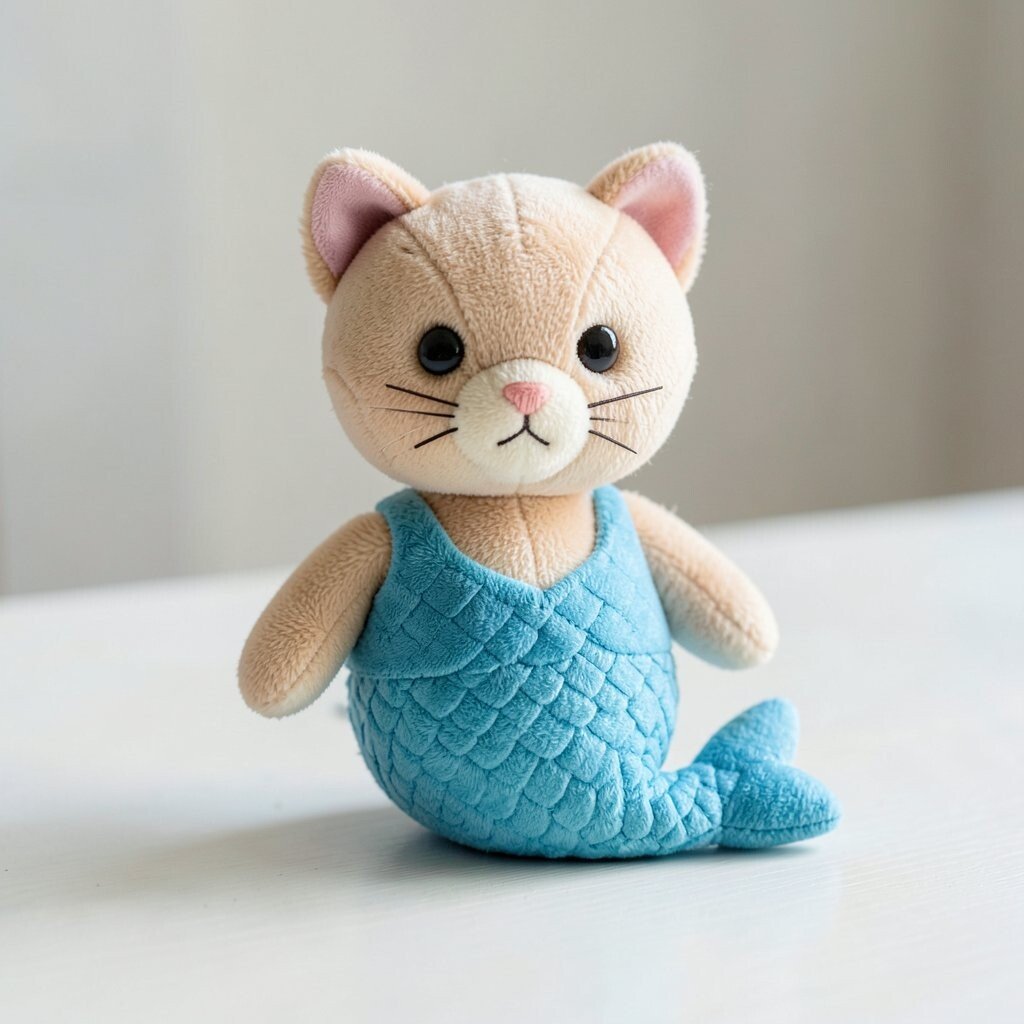 A mermaid cat creature blends a cat face with a shiny tail, making it feel magical and fun. The soft body can be covered in sparkly fabric, pastel scales, or smooth cotton.