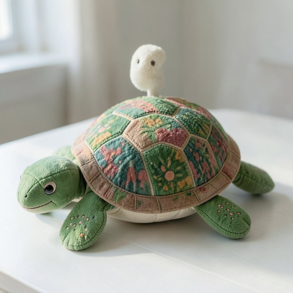 A turtle shell pillow toy has a rounded shell, stubby legs, and a gentle face. The shell can be made in patches, prints, or textured fabric for a rich look.