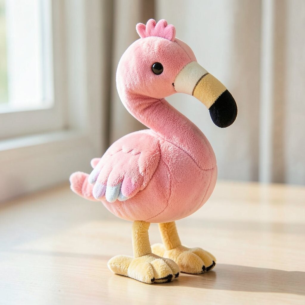 A flamingo flair plush has a tall neck, curved beak, and long legs that give it a fancy look. Pink fabric and soft stuffing make it feel bright and cheerful.