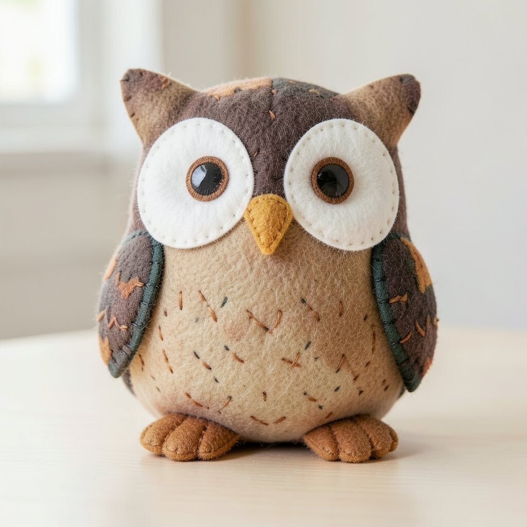 A felt owl pillow toy has round eyes, tiny wings, and a plump body that feels soft in small hands. Its simple shape makes it easy to hold, toss, or rest against during story time.