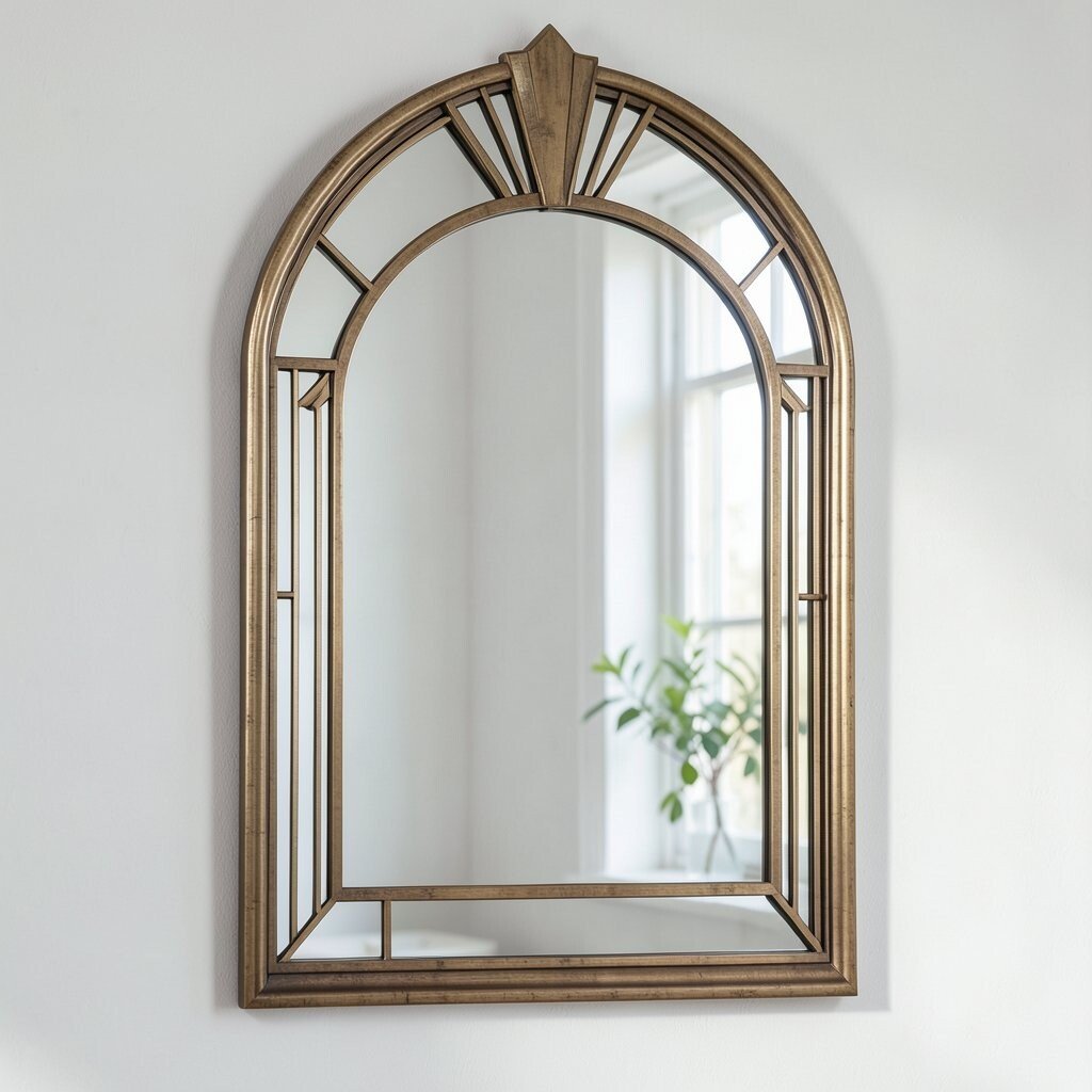 An Art Deco arch mirror adds a touch of vintage glamour and geometric flair. Its bold lines and curves are distinctive.