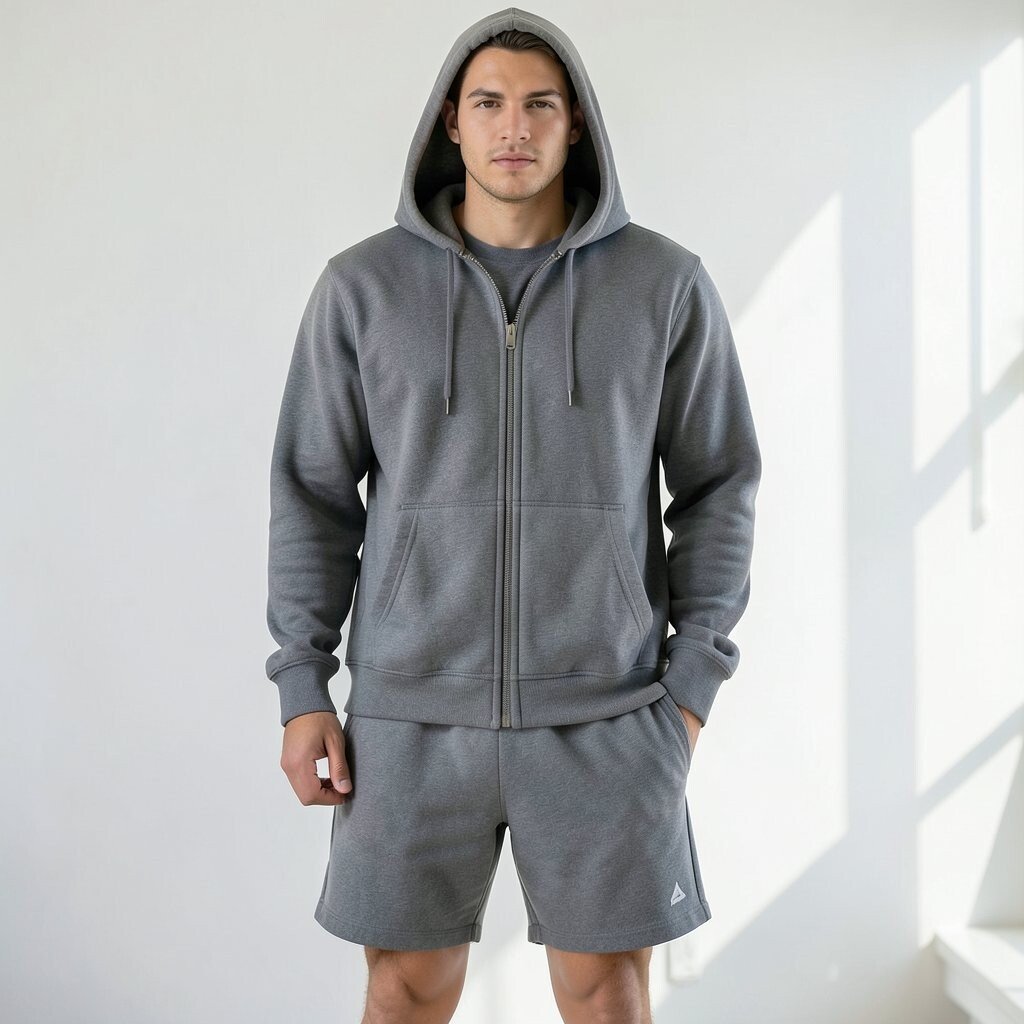 Shorts provide freedom of movement, making this an excellent choice for active days. A zip-up adds convenience and comfort.