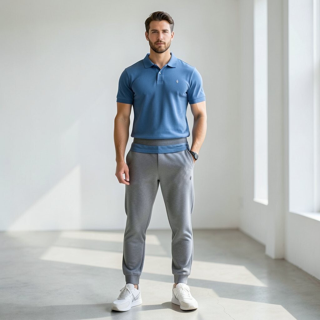 A polo shirt adds a touch of sophistication to athleisure wear. Pair it with jogger pants for a smart-casual look.