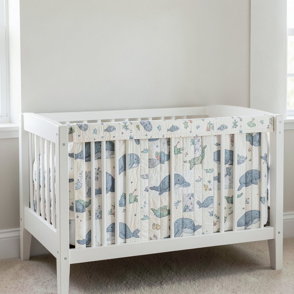 Sail the seas with this quilt featuring adorable whales and ocean waves. It’s a charming and playful addition to your nursery.