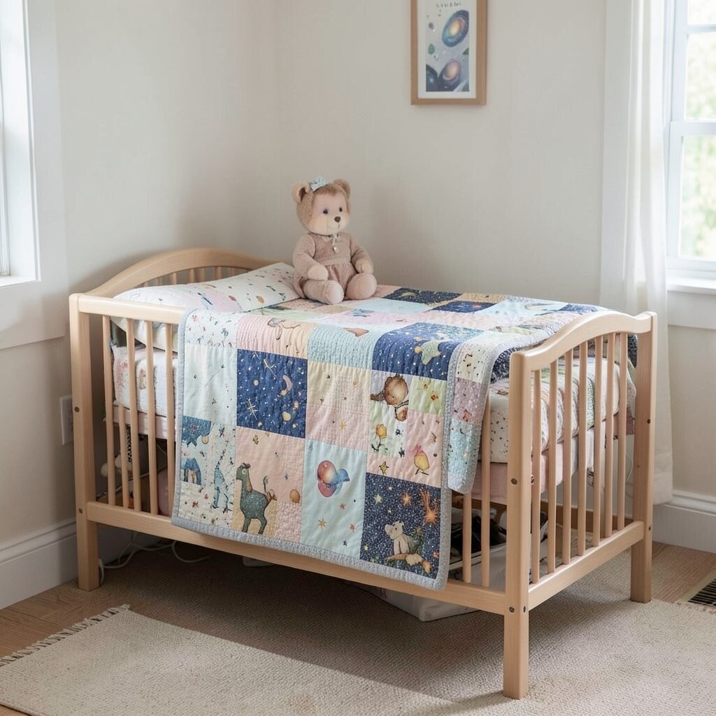 This quilt is sprinkled with stars and moons, offering a soothing night sky for your little one. It’s a gentle reminder of the vast universe.