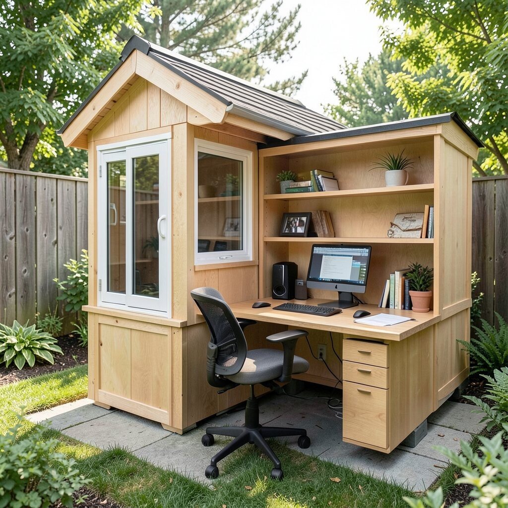 Equipped with a desk, a comfy chair, and shelves for your essentials, this space is both functional and inviting. Add string lights around the exterior to create a magical glow during evening work sessions. Personalize the interior with photos and plants to make it truly yours.