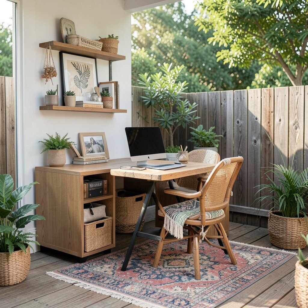 An outdoor office with a bohemian vibe is full of personality and creativity. Colorful textiles and eclectic furniture pieces create a relaxed atmosphere.