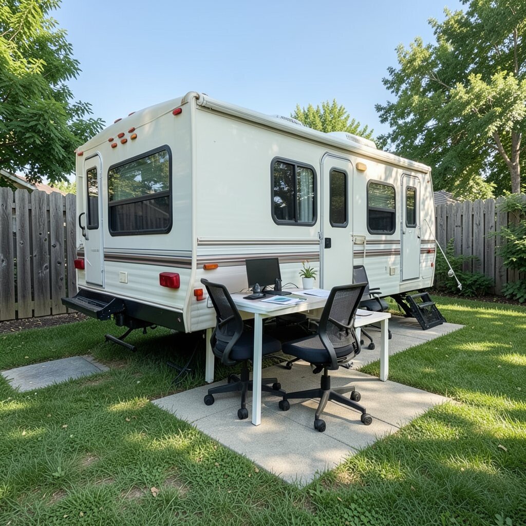 Renovate the interior to suit your work needs, with a desk, chair, and storage. Utilize the existing design of the RV to maximize space.