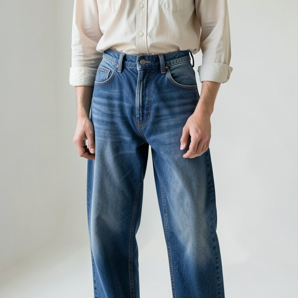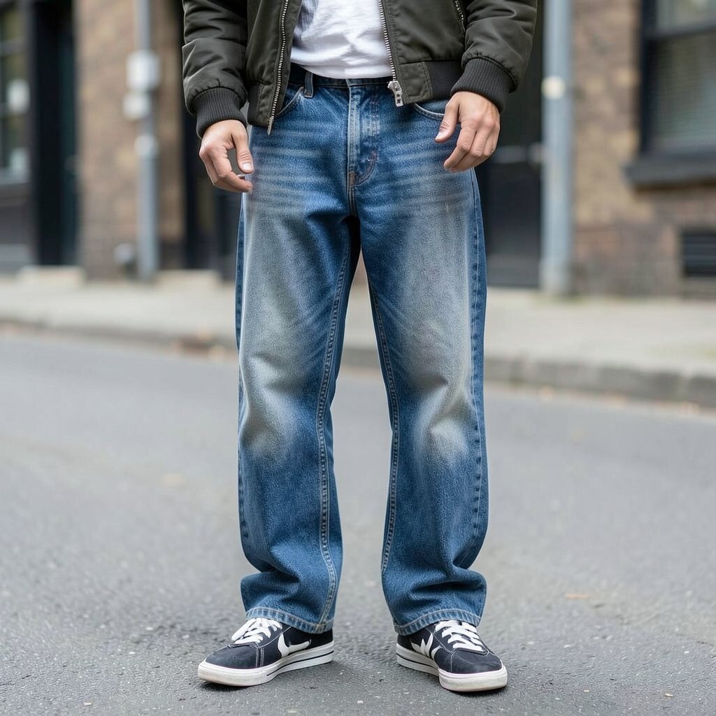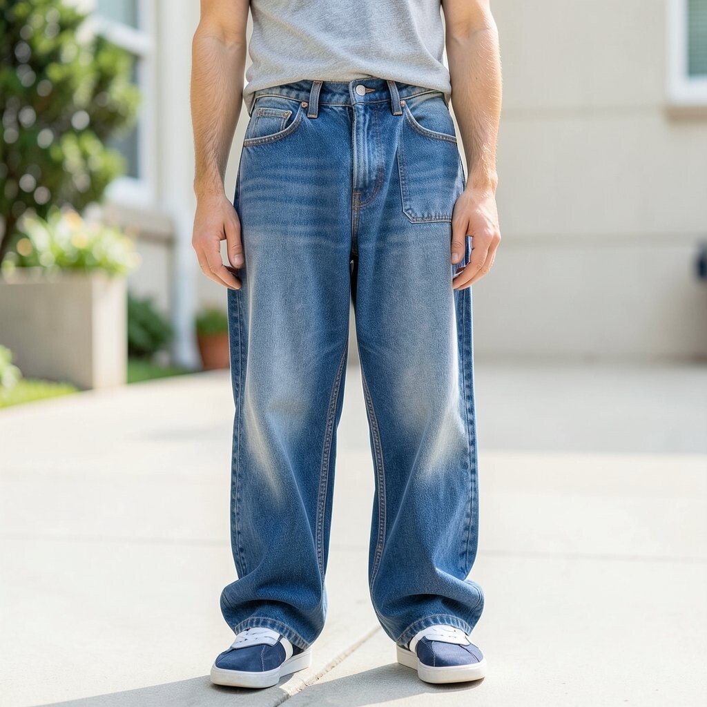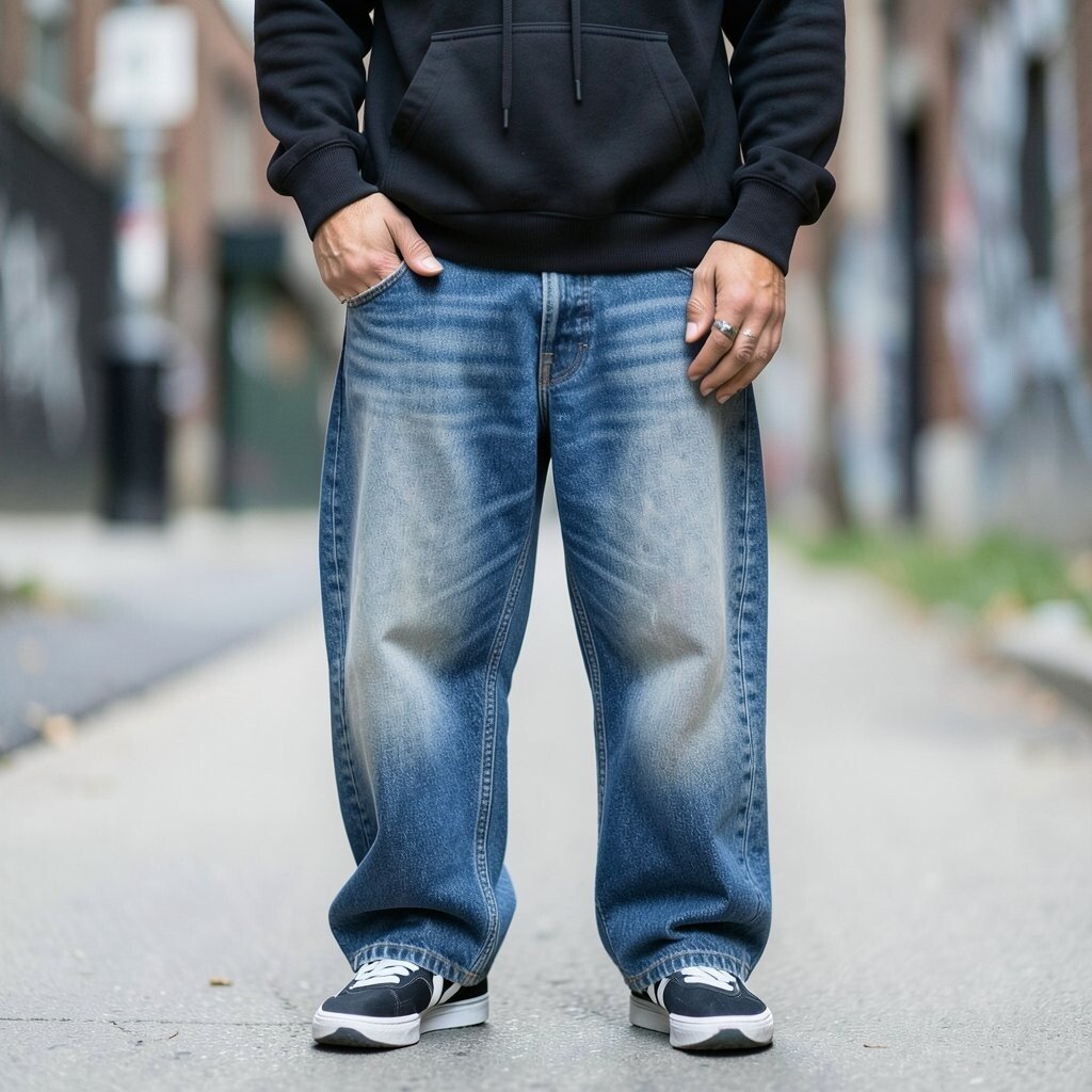 A button-up shirt with baggy jeans offers casual sophistication. It’s a look that can easily be dressed up or down.