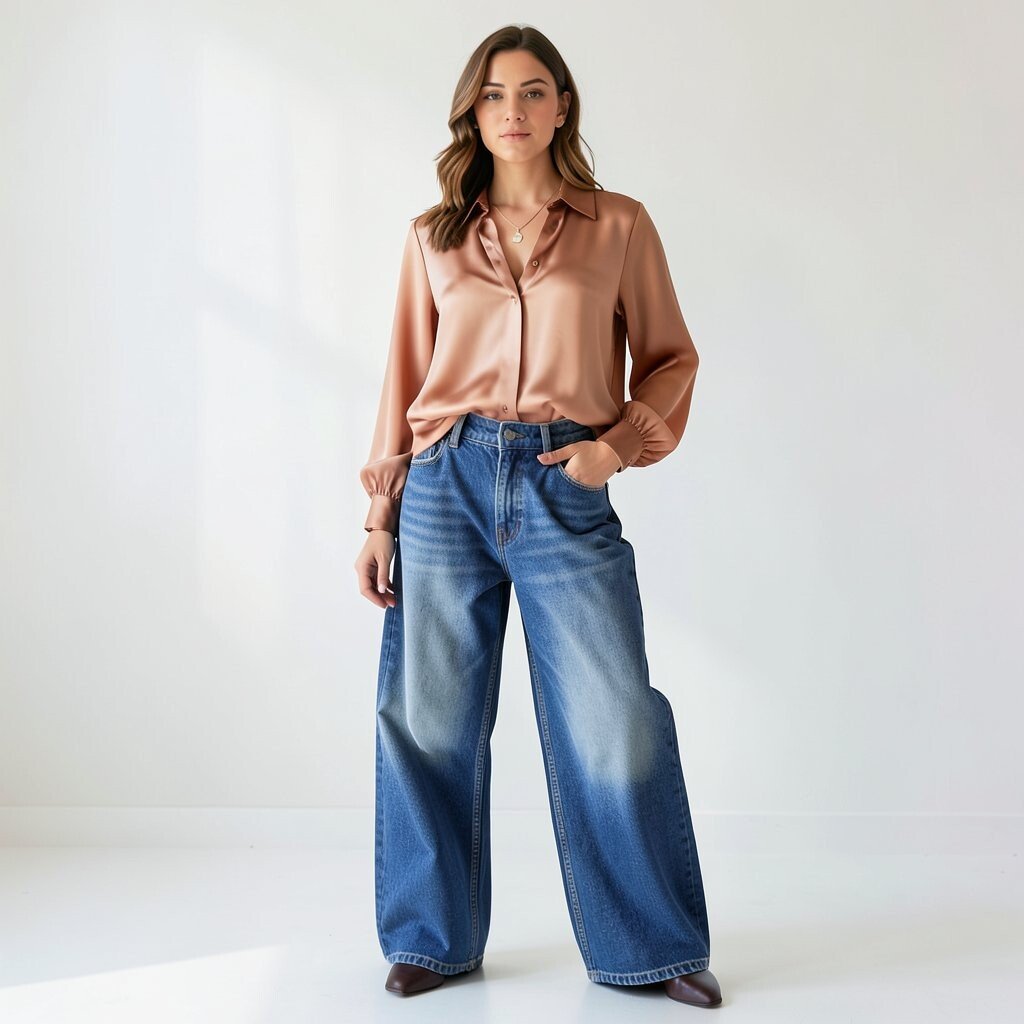 A silk blouse paired with baggy jeans creates an elegant yet relaxed outfit. This mix of textures is visually appealing.
