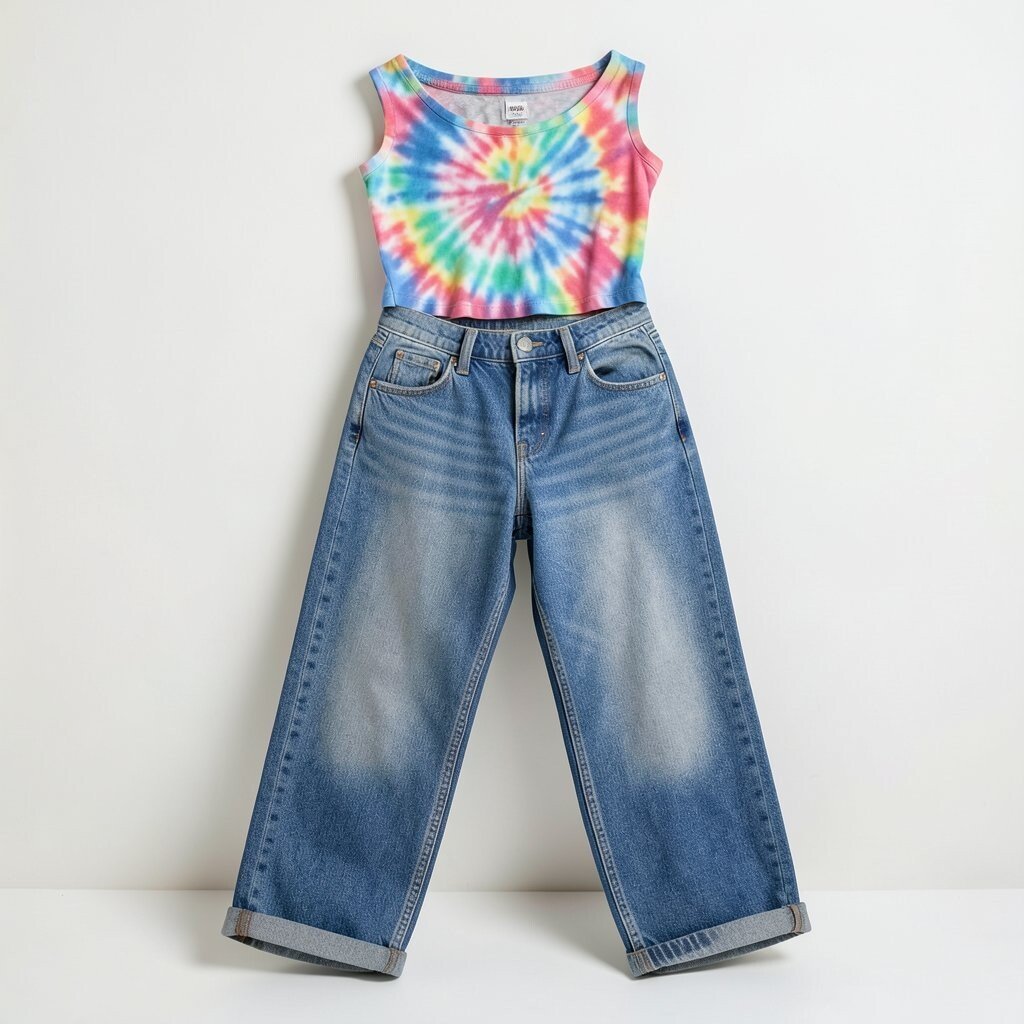 A tie-dye top with baggy jeans adds a funky and colorful twist to your style. It’s a playful and vibrant look.