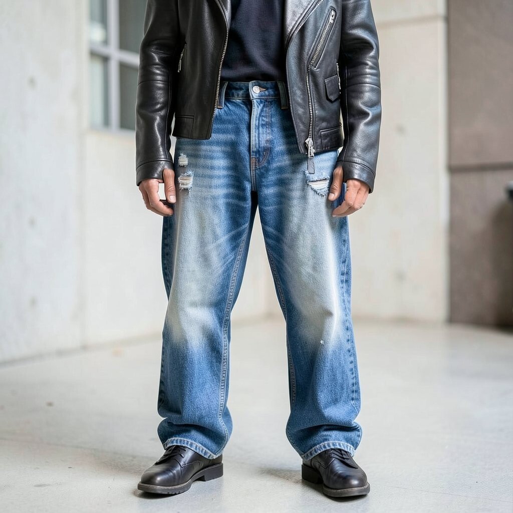 Leather jackets give baggy jeans an edgy twist. This pairing is perfect for cooler days.