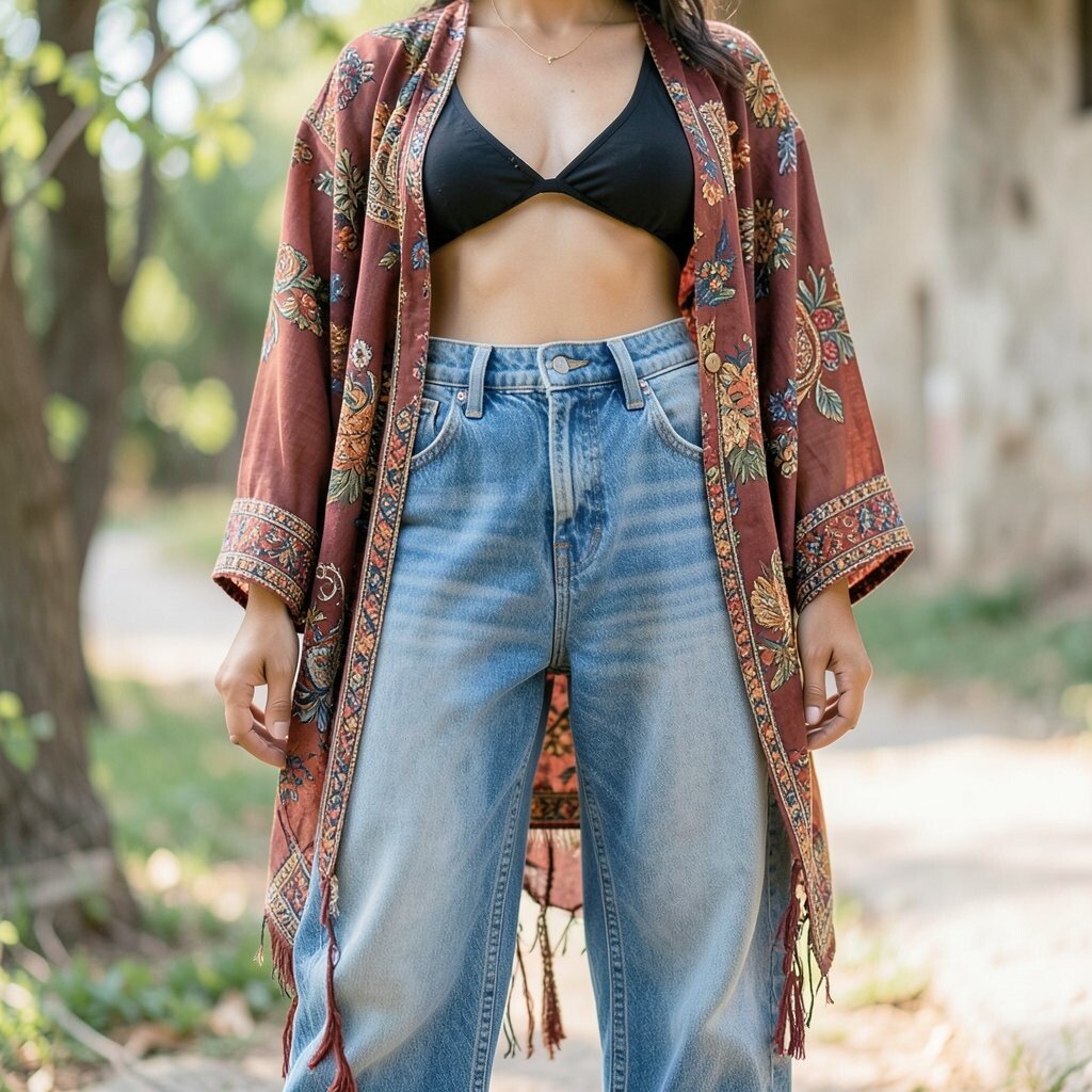 Adding a kimono over baggy jeans brings a touch of bohemian flair. It’s a look that’s both relaxed and artistic.