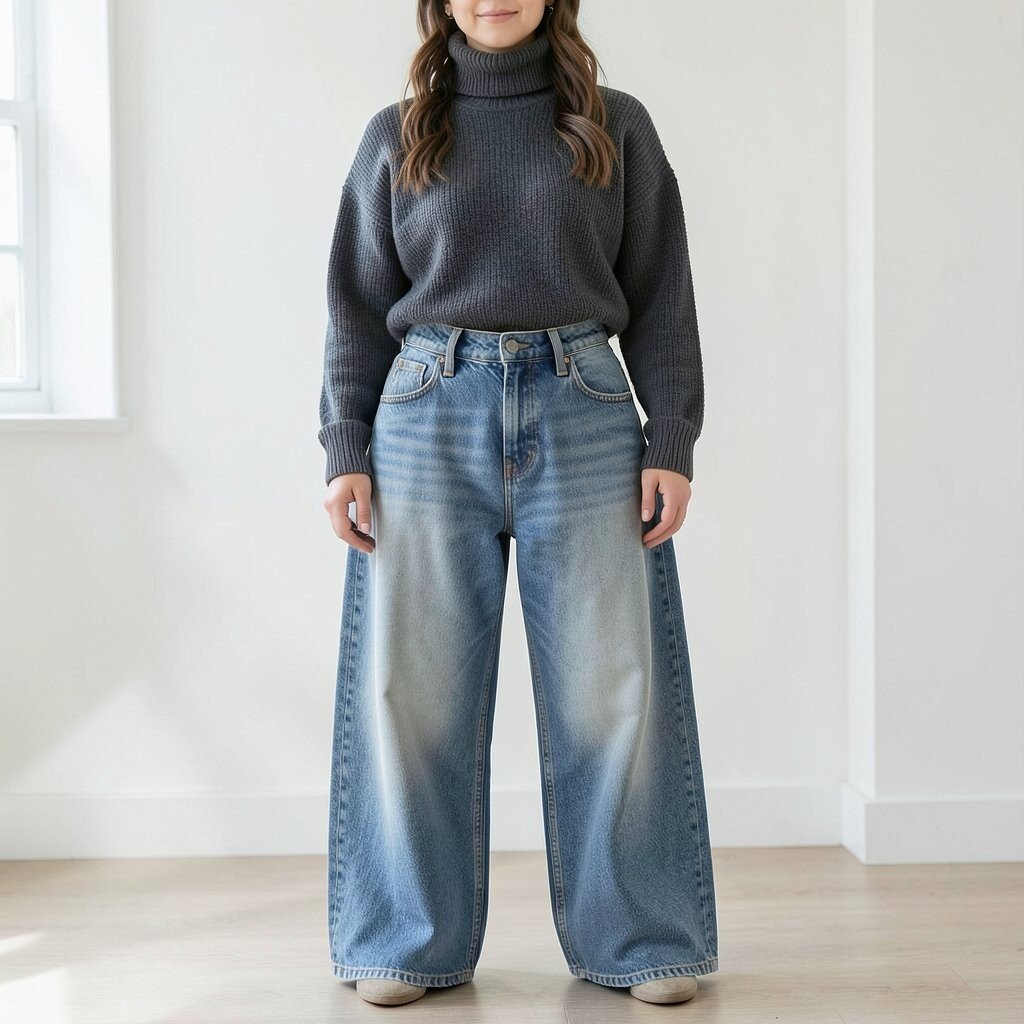 A turtleneck with baggy jeans offers an artistic flair. It’s a look that’s both sophisticated and cozy.