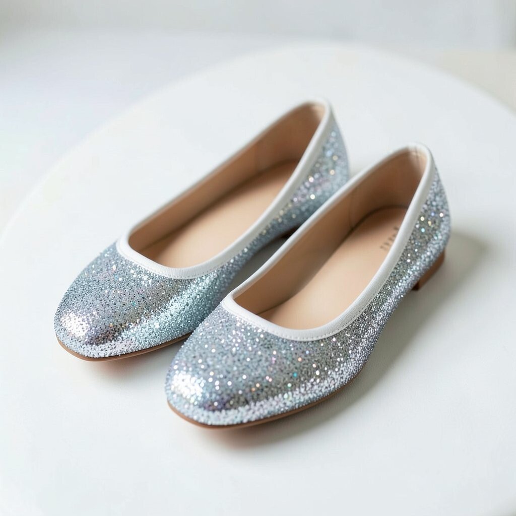 Glitter ballerina flats bring a sparkle to your step. Their shimmering surface catches the light beautifully.