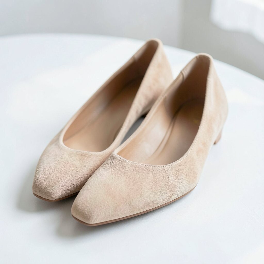 Nude suede ballerinas add a soft touch to your ensemble. Their neutral tone blends seamlessly with any color palette.