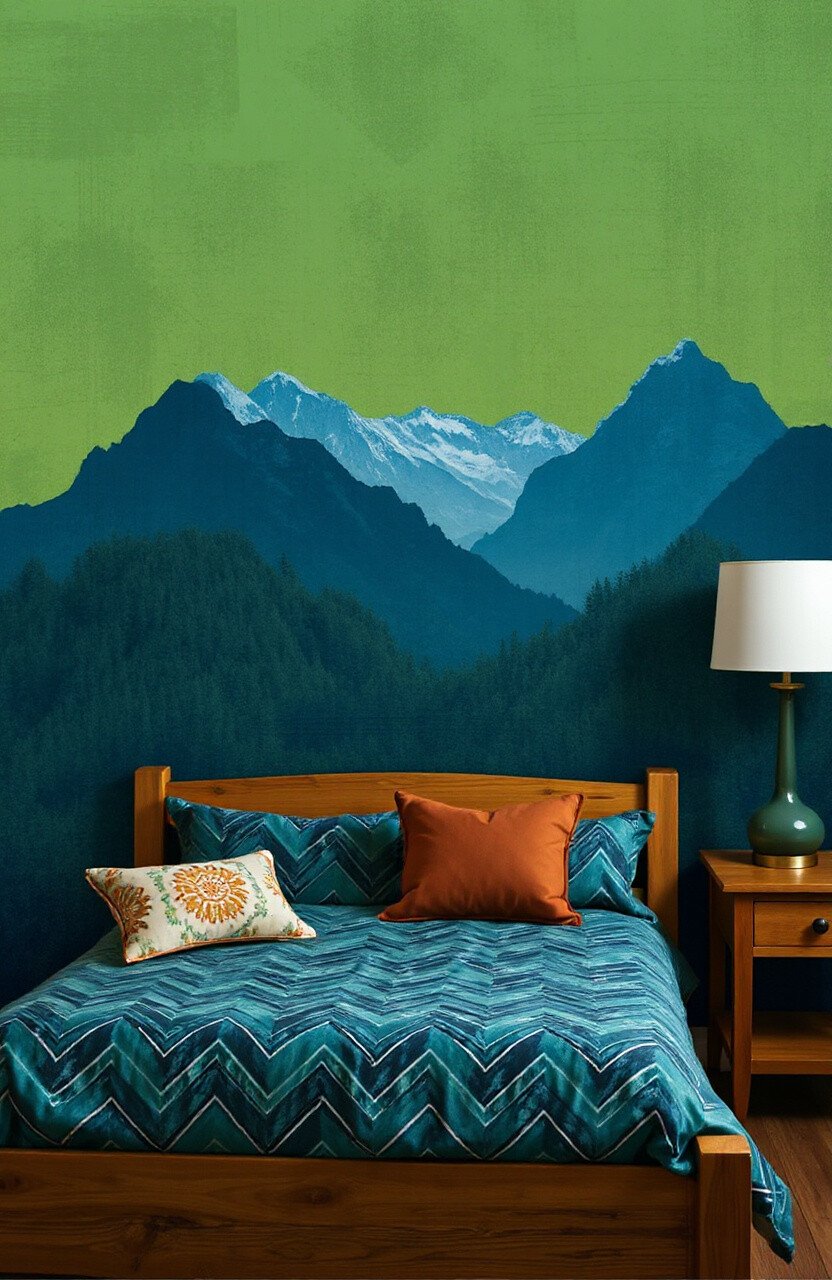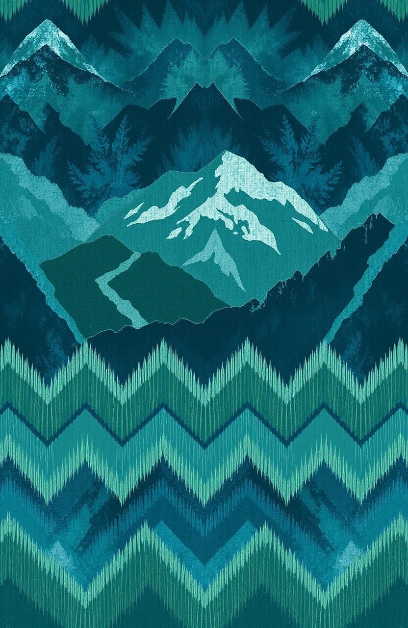 Deep blues and greens create a majestic, mountain-like feel. The batik chevron pattern adds depth and texture.