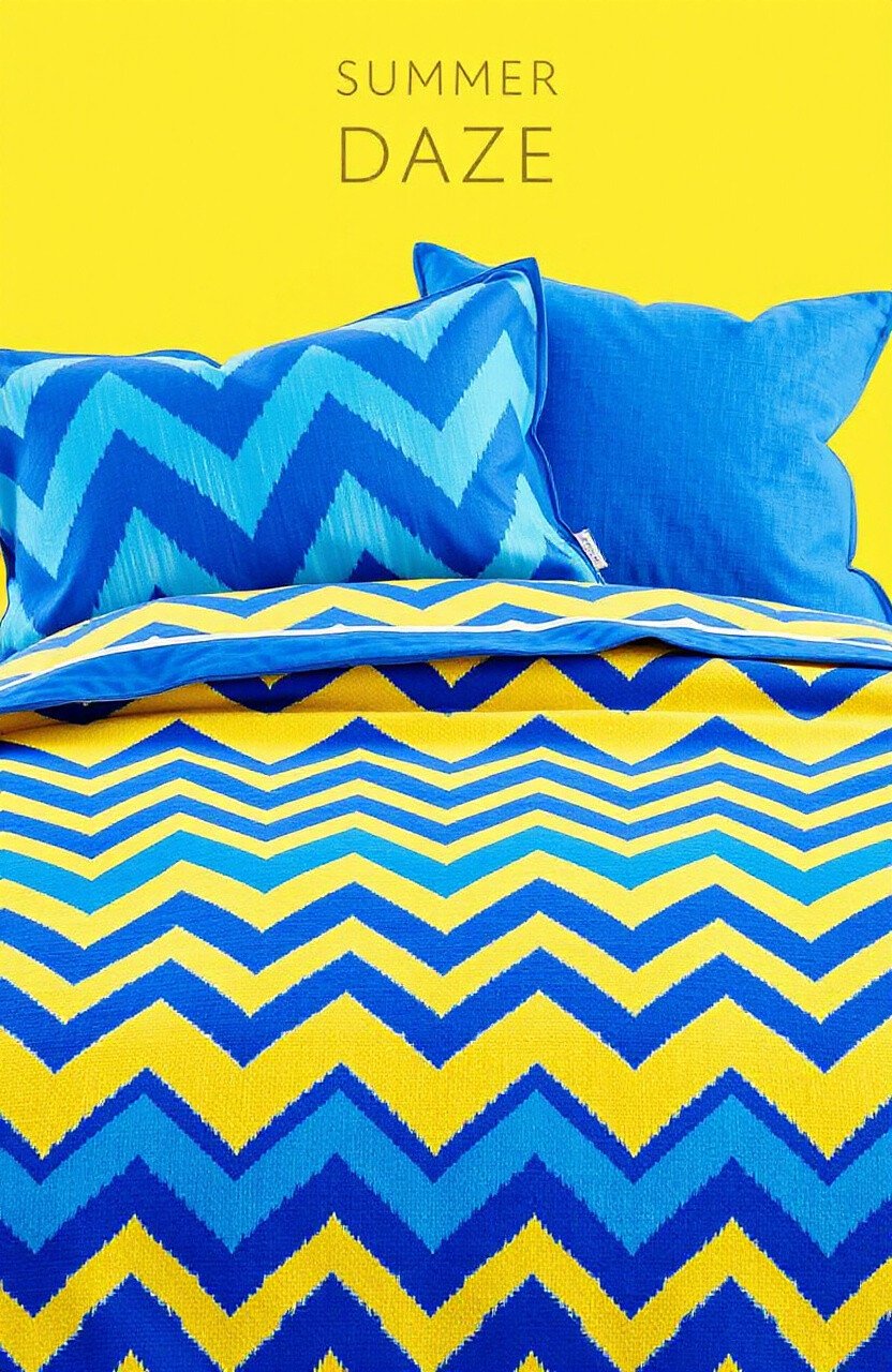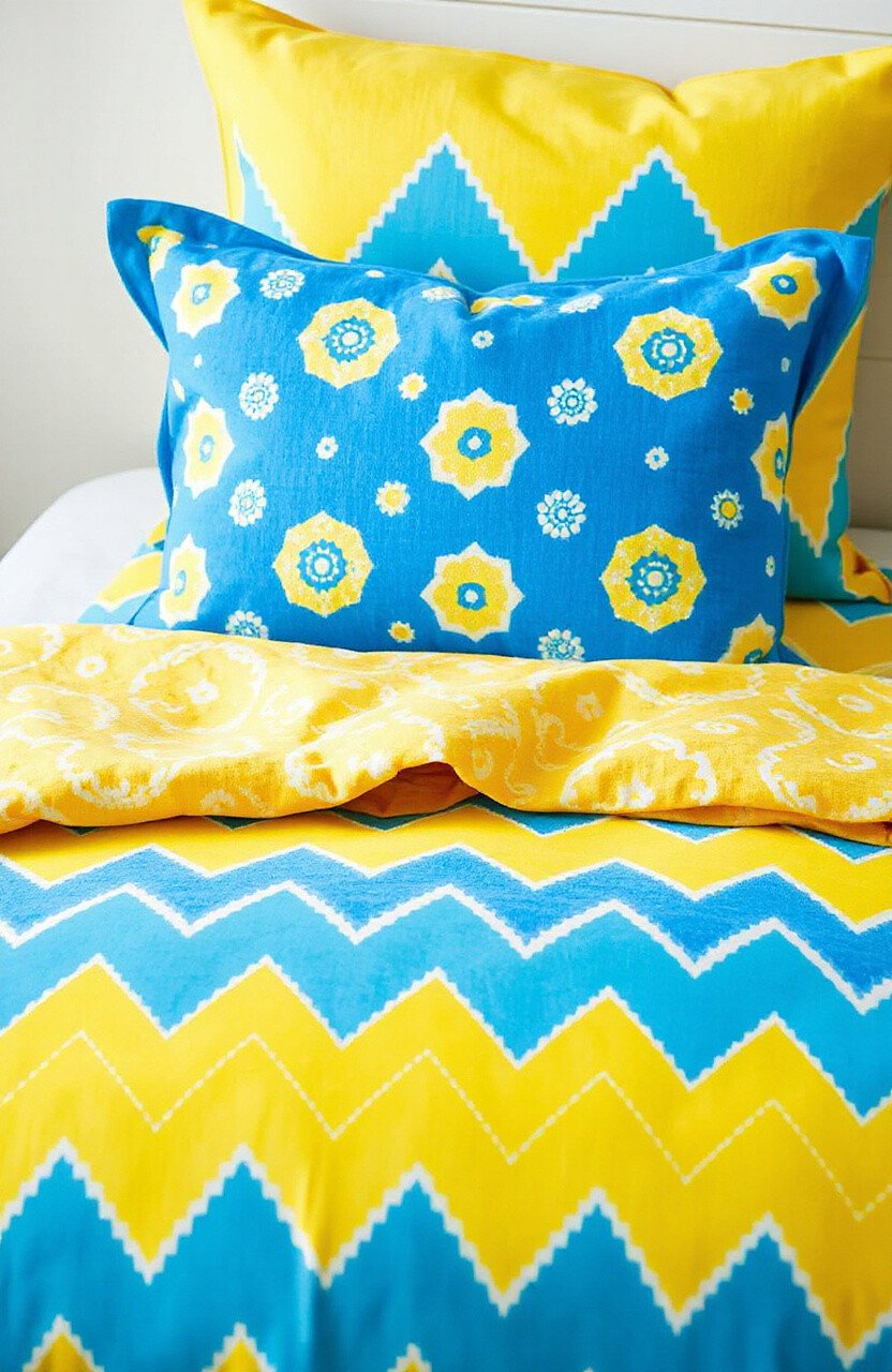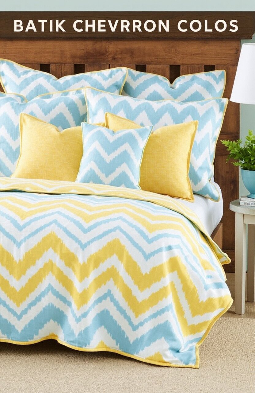 Bright blues and yellows create a fresh, breezy feel. The batik chevron pattern adds a playful touch.
